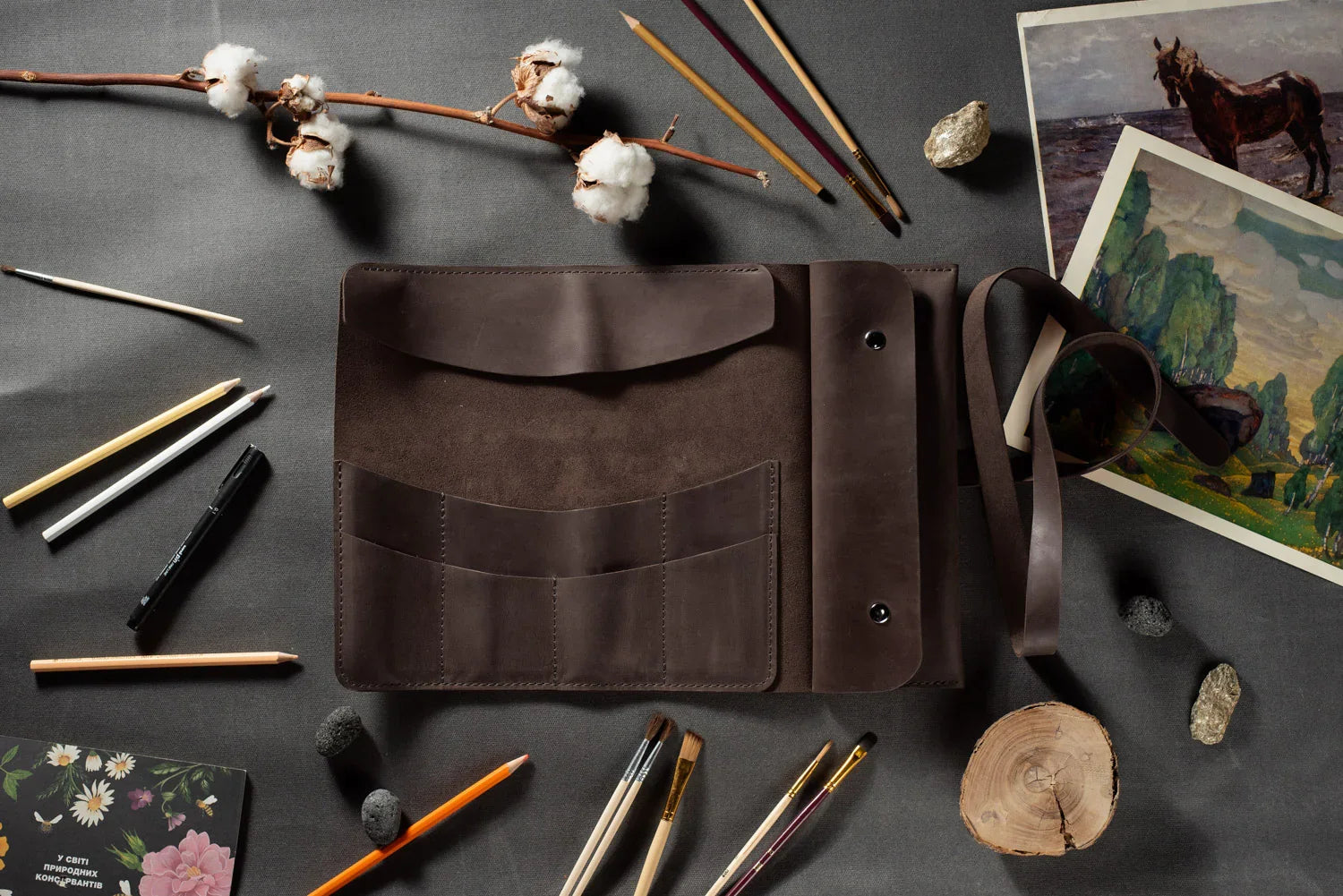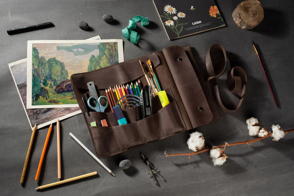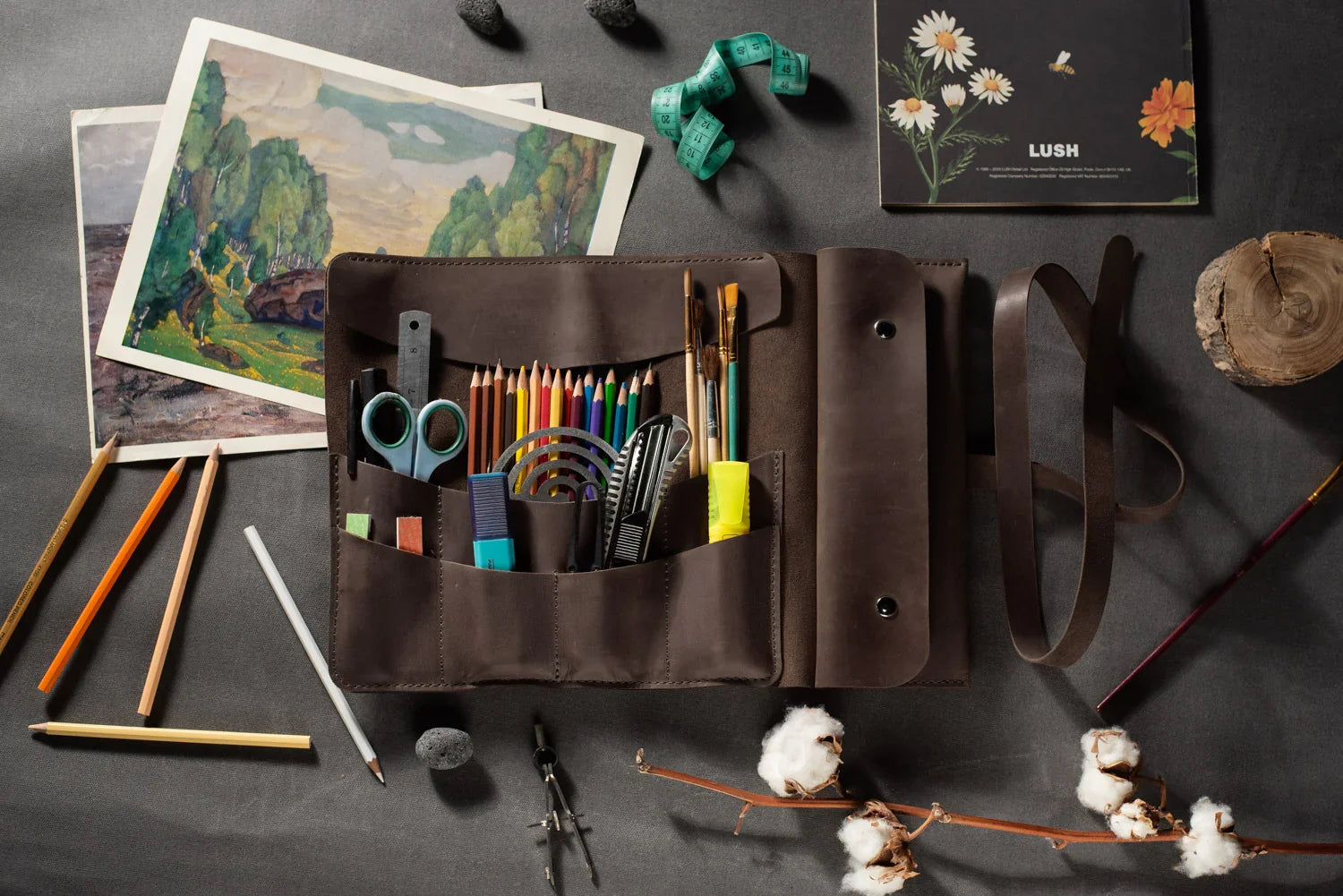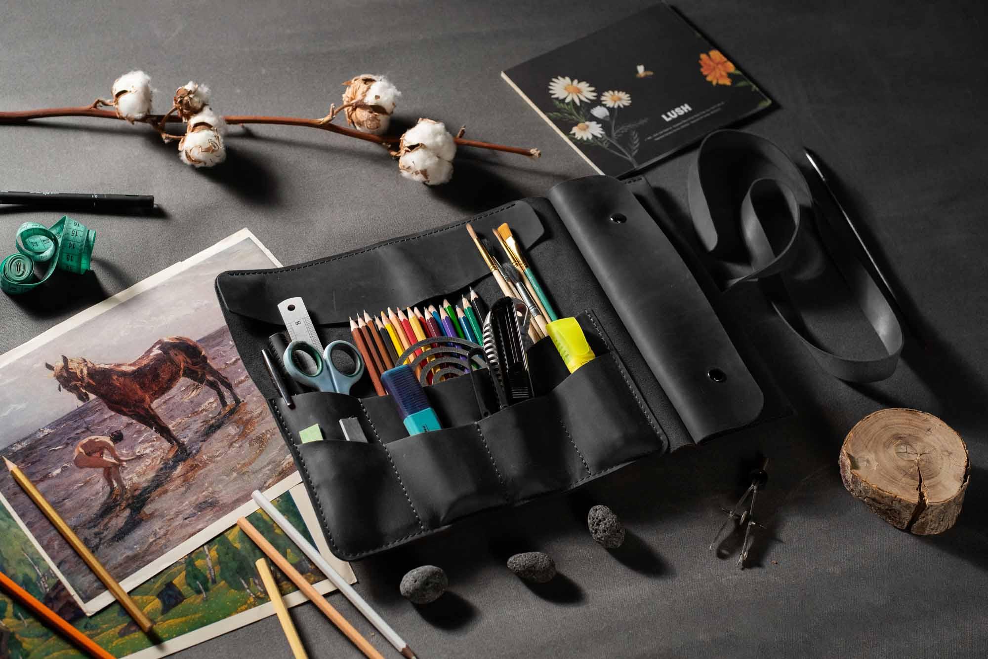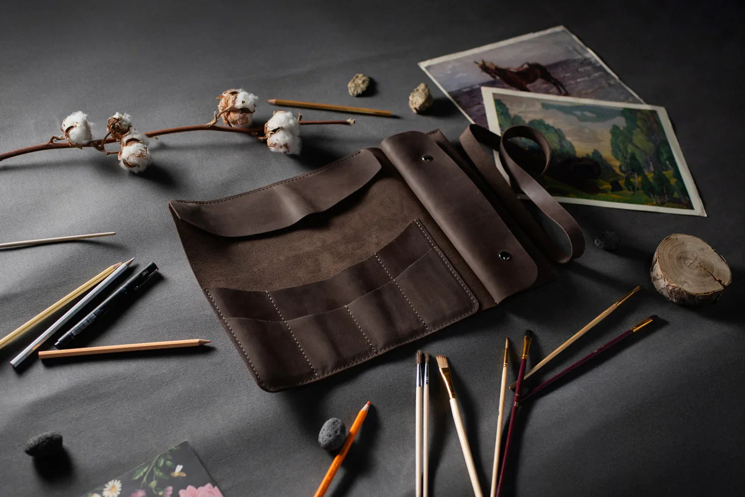 Практичний шкіряний органайзер створений для майстрів, художників, студентів і фахівців, яким потрібне компактне рішення для зберігання робочих інструментів. У ньому зручно тримати пензлі, ручки, ножі, косметичні пензлі чи креслярські приладдя – все під рукою й у безпеці.