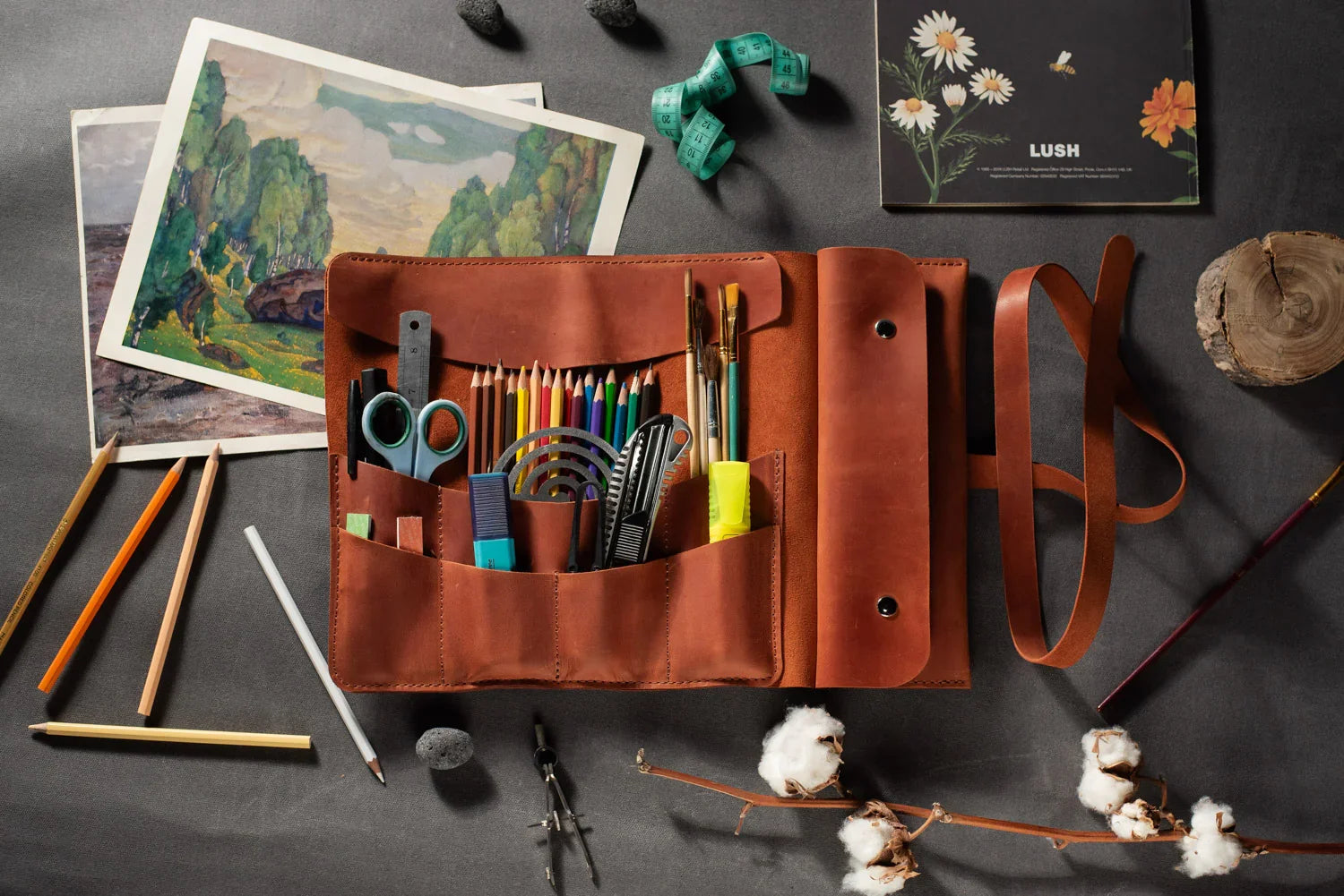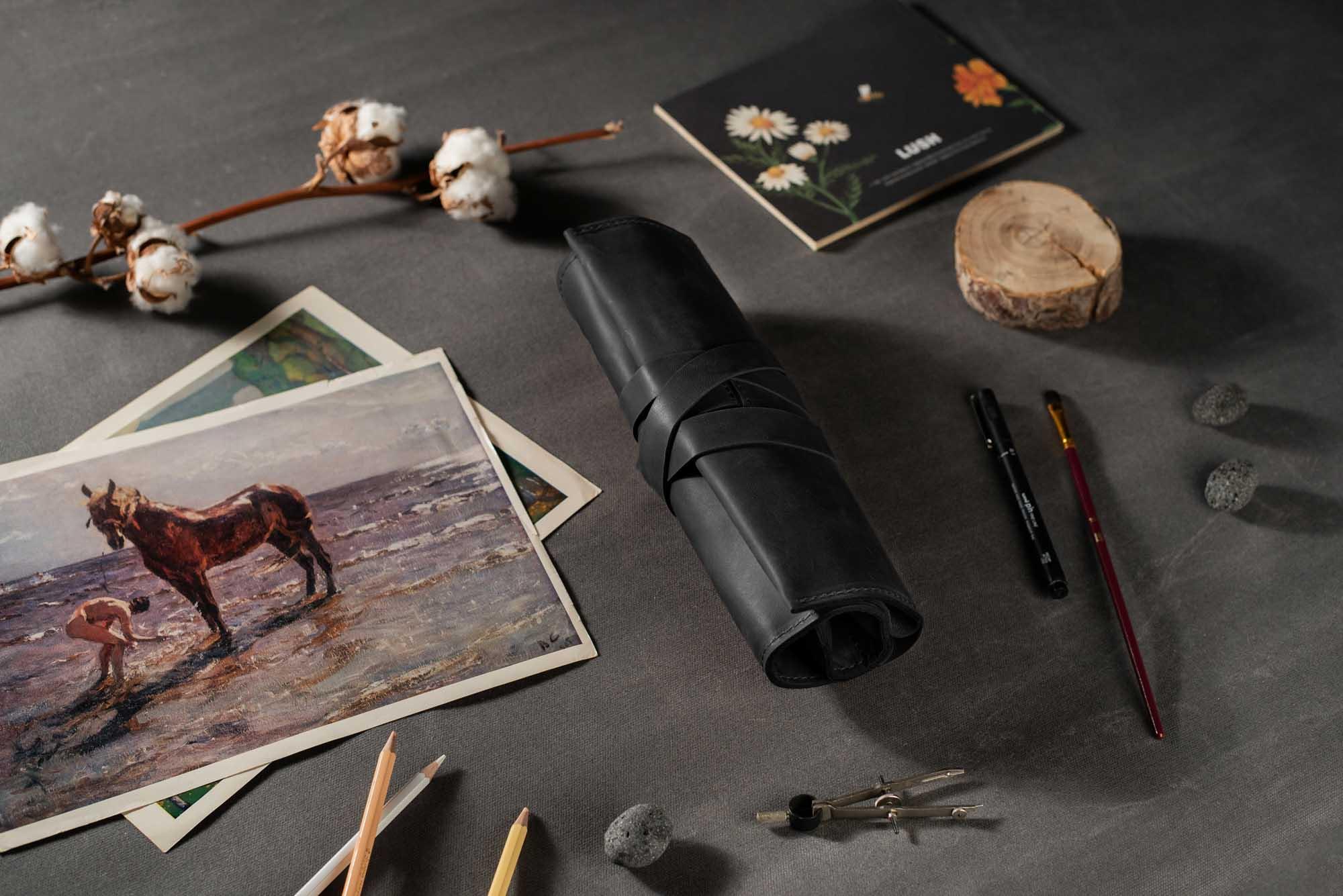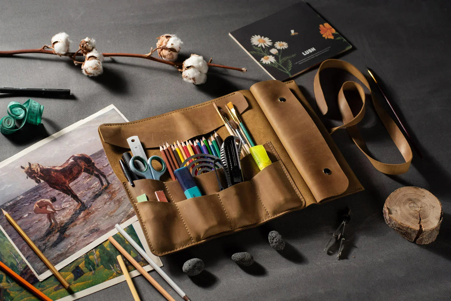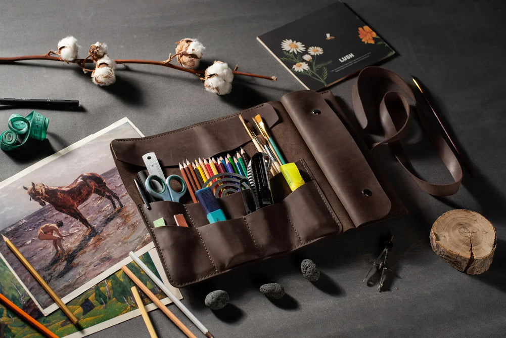 Практичний шкіряний органайзер створений для майстрів, художників, студентів і фахівців, яким потрібне компактне рішення для зберігання робочих інструментів. У ньому зручно тримати пензлі, ручки, ножі, косметичні пензлі чи креслярські приладдя – все під рукою й у безпеці.