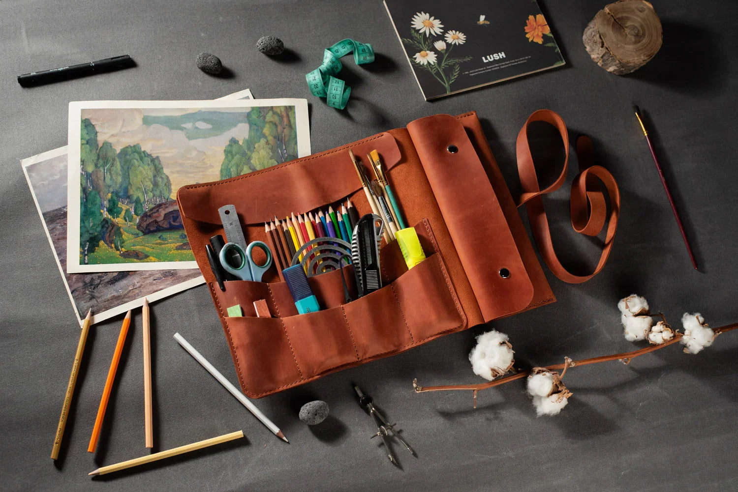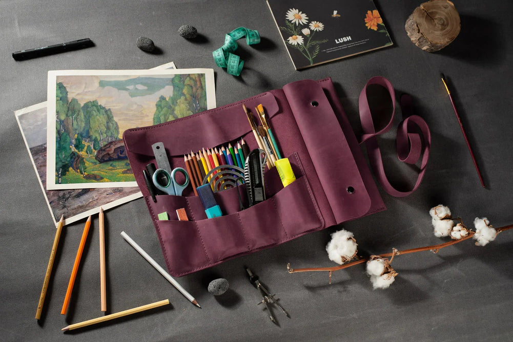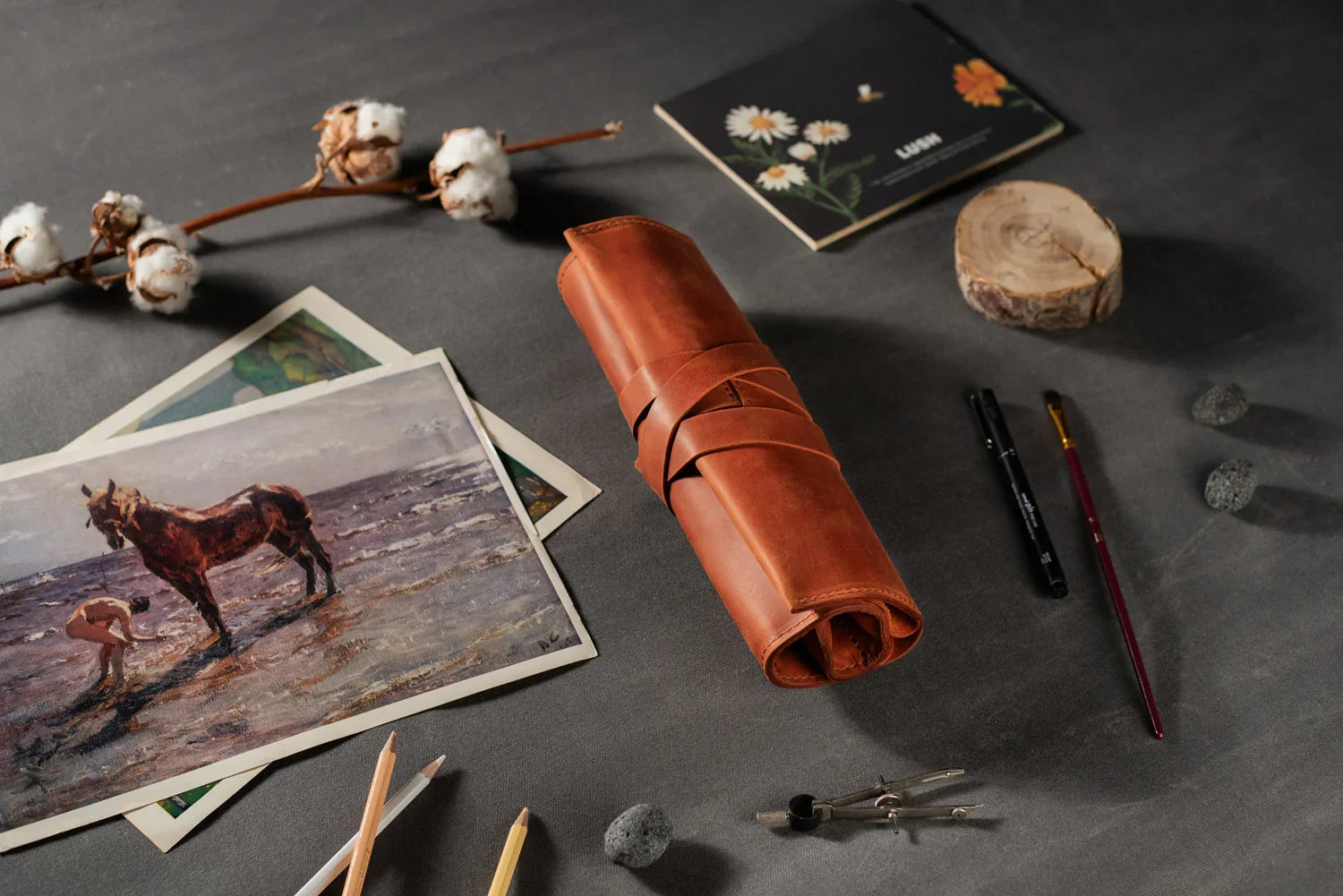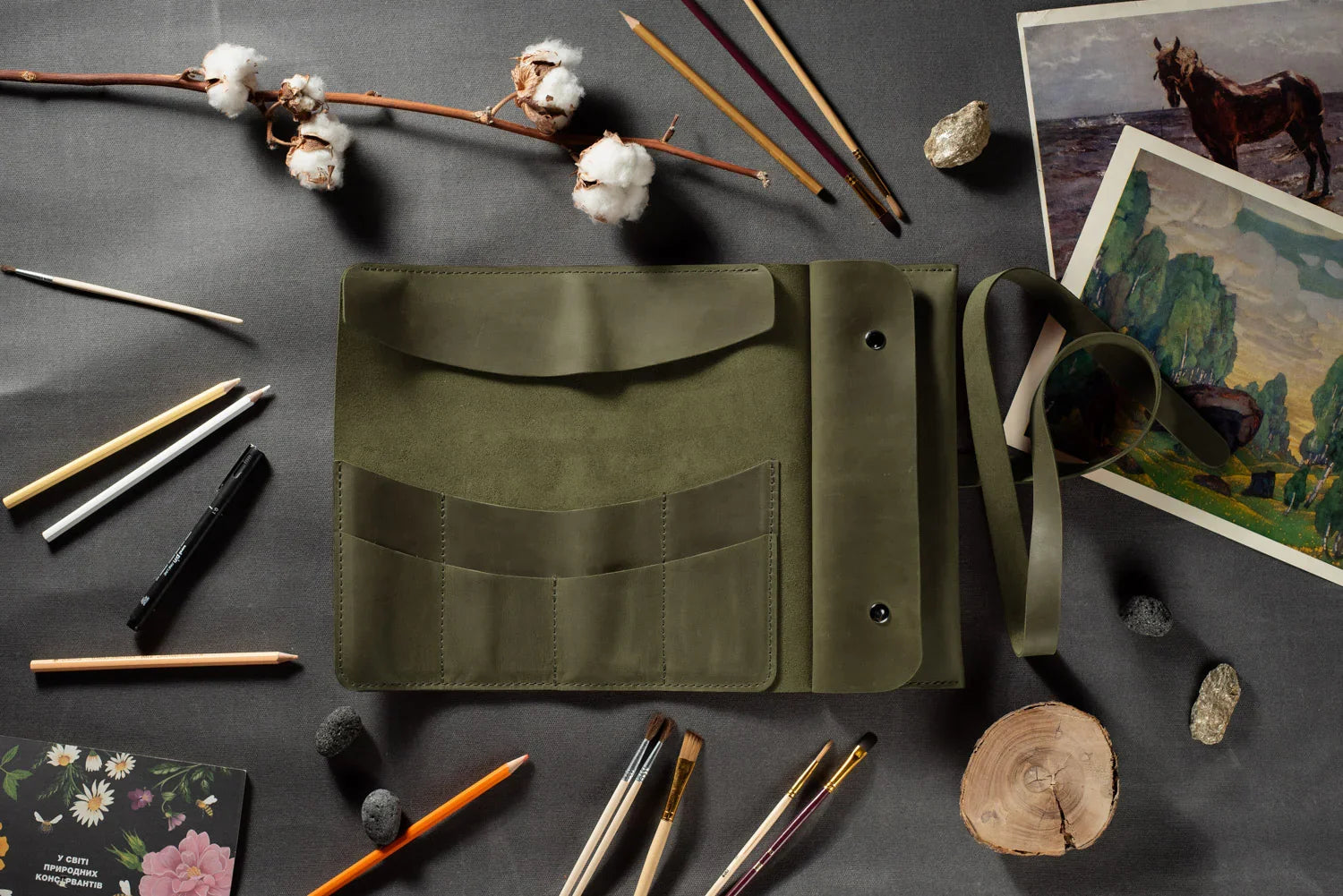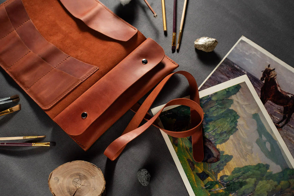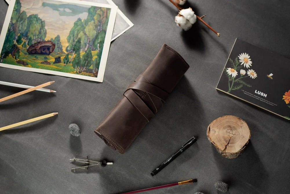 Практичний шкіряний органайзер створений для майстрів, художників, студентів і фахівців, яким потрібне компактне рішення для зберігання робочих інструментів. У ньому зручно тримати пензлі, ручки, ножі, косметичні пензлі чи креслярські приладдя – все під рукою й у безпеці.