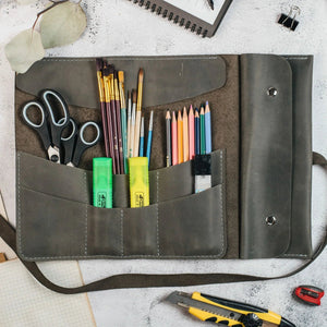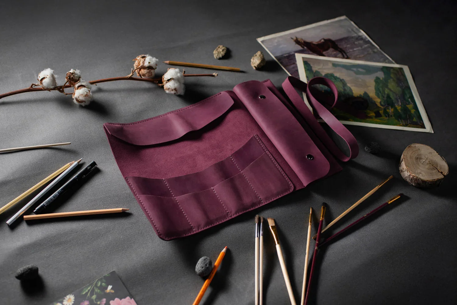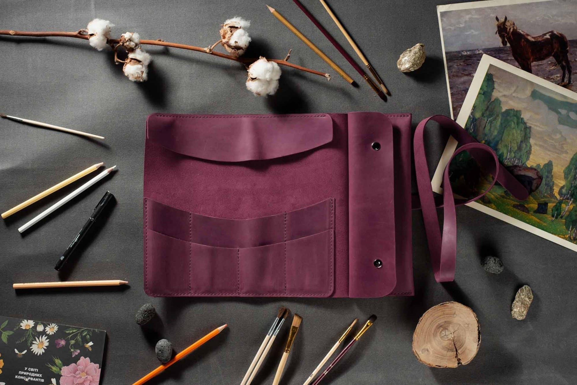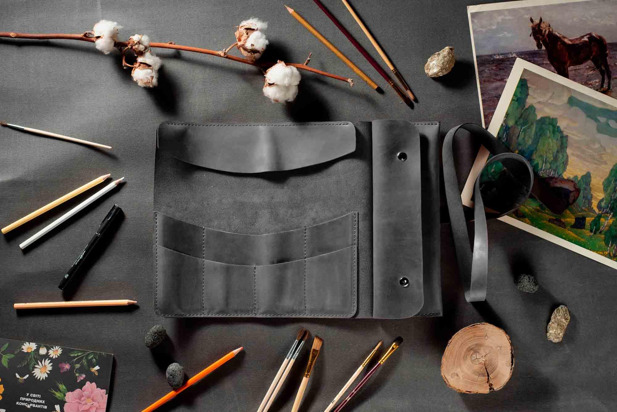 Виготовлений вручну з гладкої натуральної шкіри, що має полірувану поверхню та приємну на дотик фактуру. Усередині – продумане розташування кишень різної ширини для різних типів інструментів: від тонких маркерів до пензлів або косметичних аксесуарів.