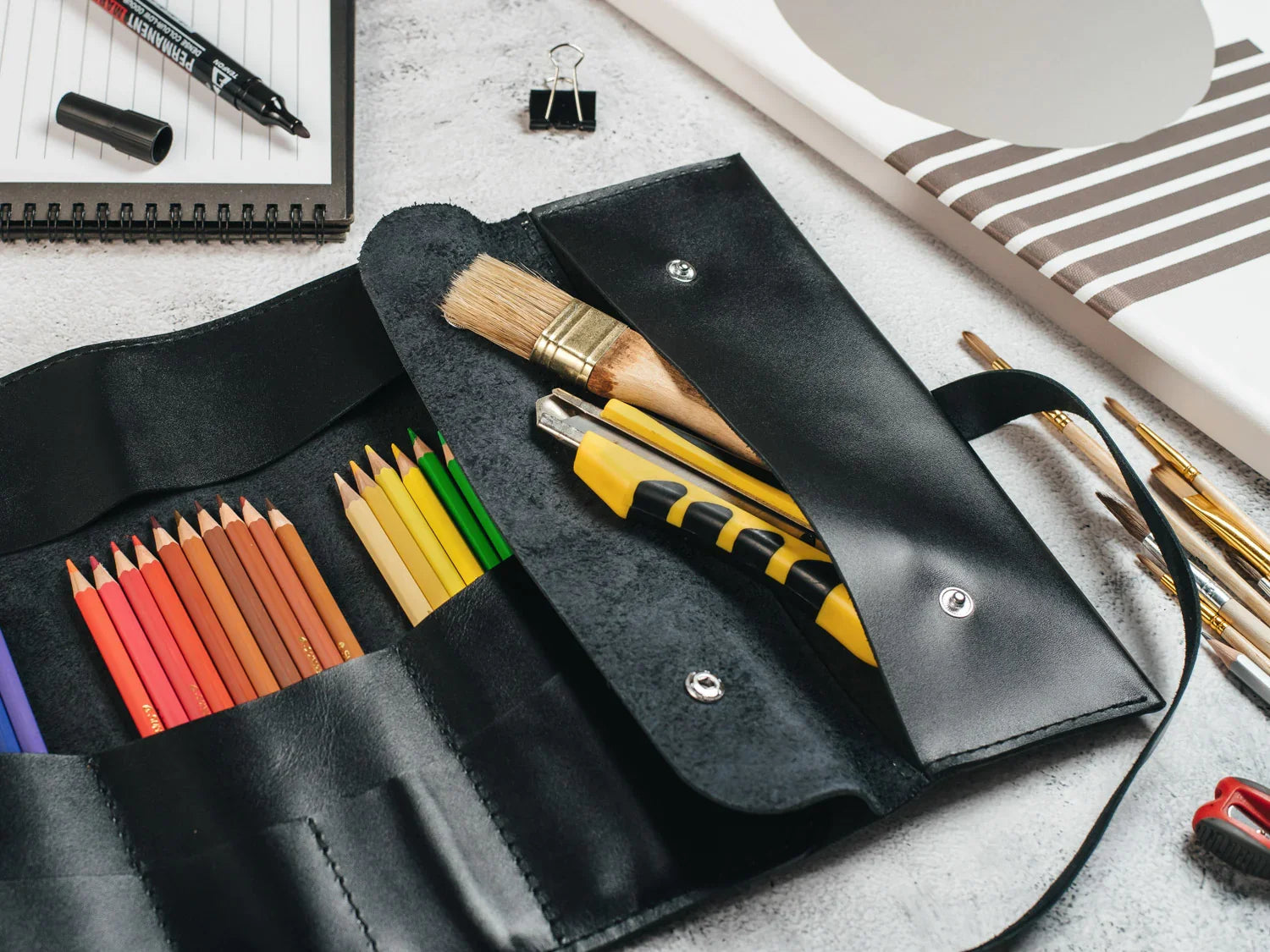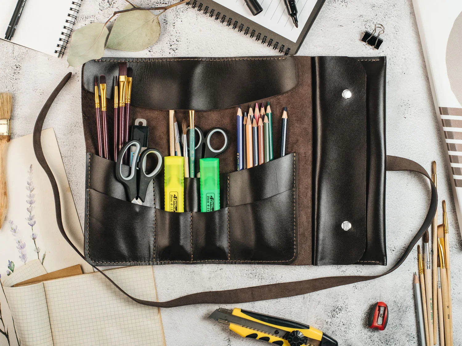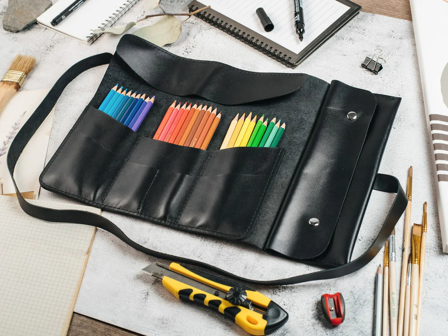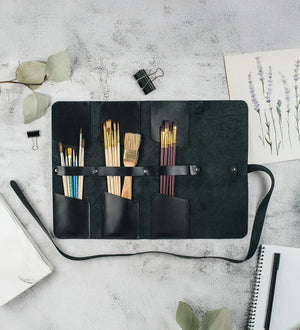 Універсальний шкіряний рол, створений для тих, хто цінує порядок, естетику та зручність. Підійде художникам, візажистам, архітекторам, студентам і всім, хто працює з інструментами щодня. Компактний дизайн дозволяє тримати все під рукою — впорядковано, захищено і зі смаком.