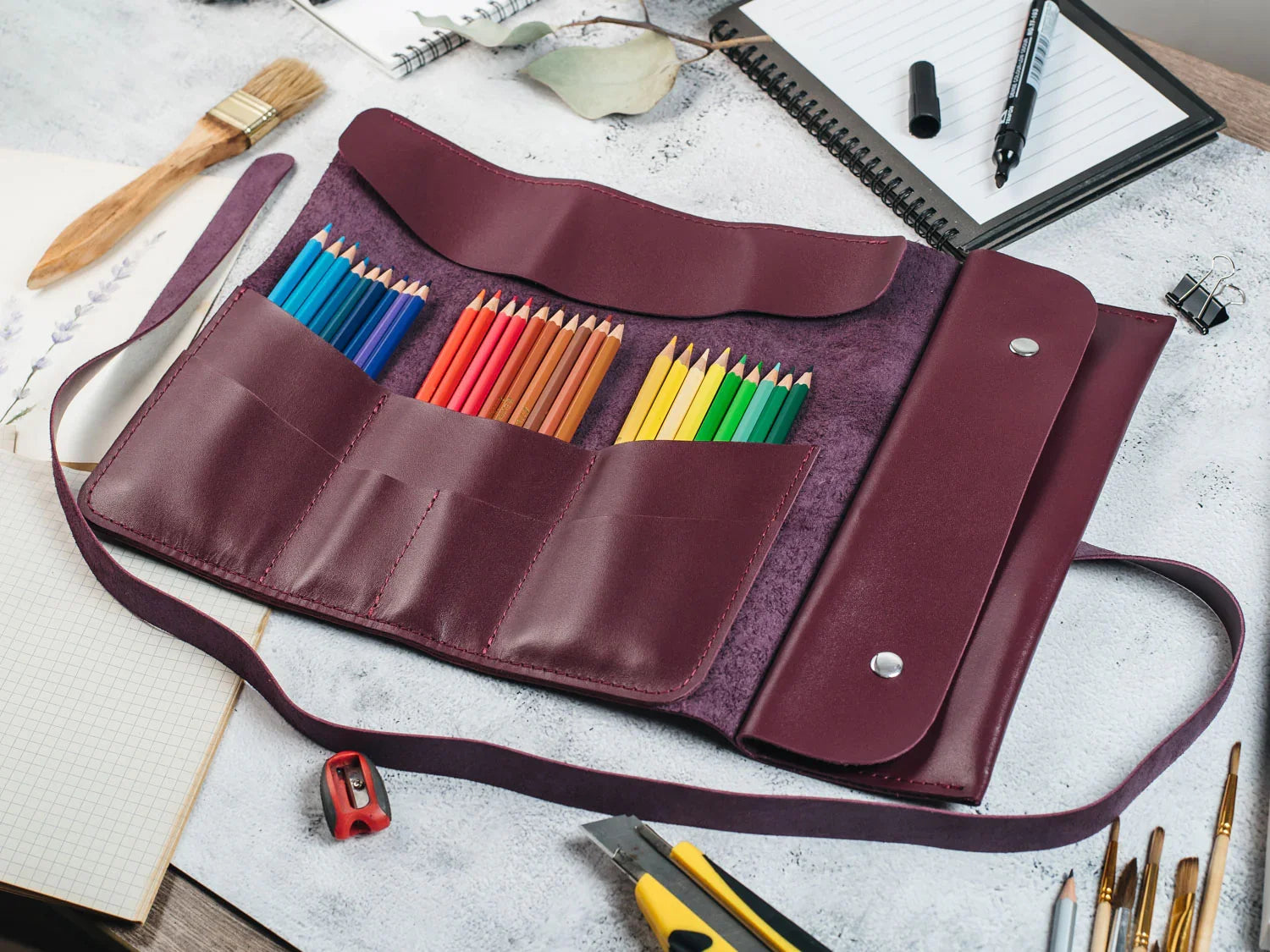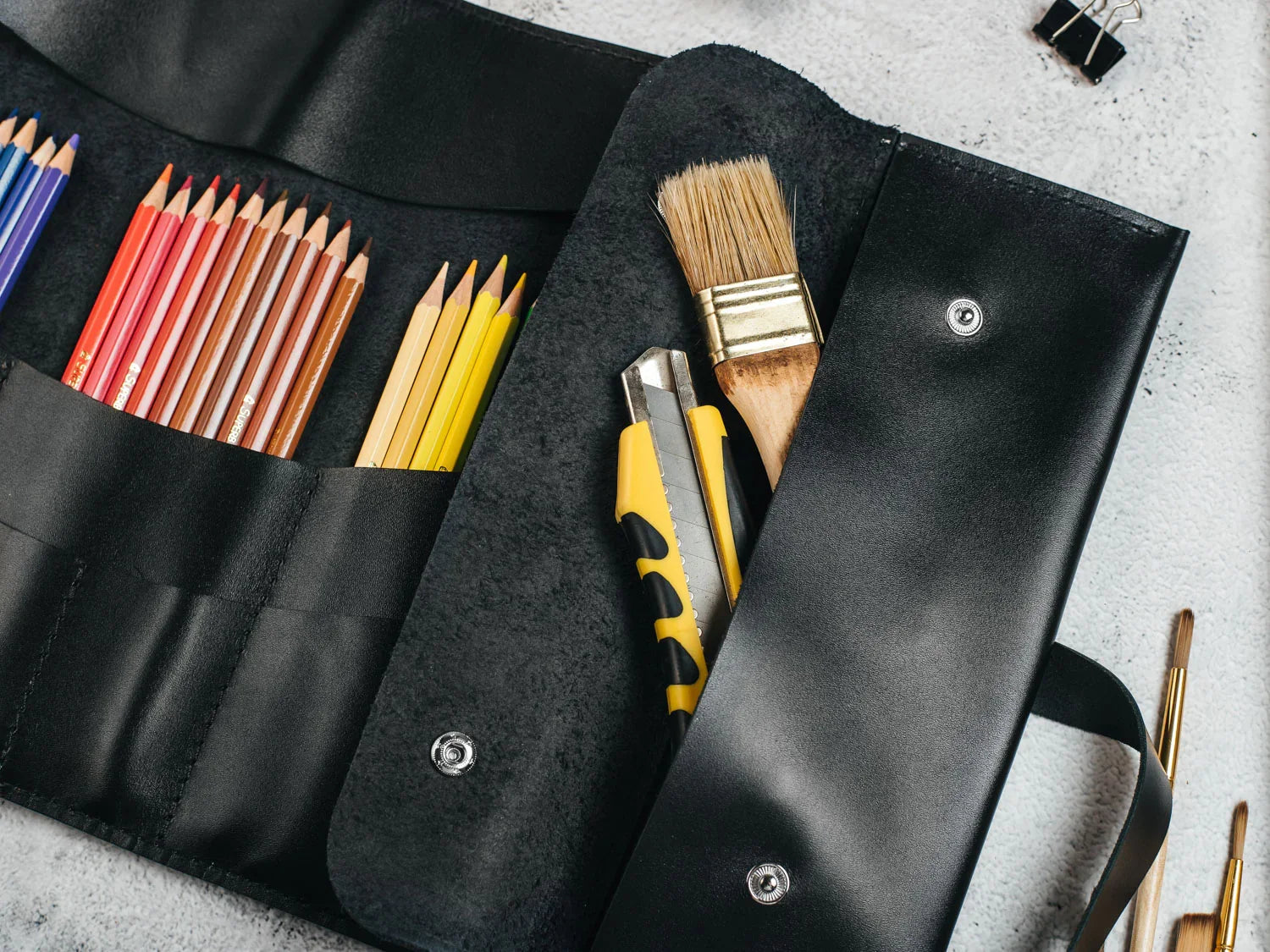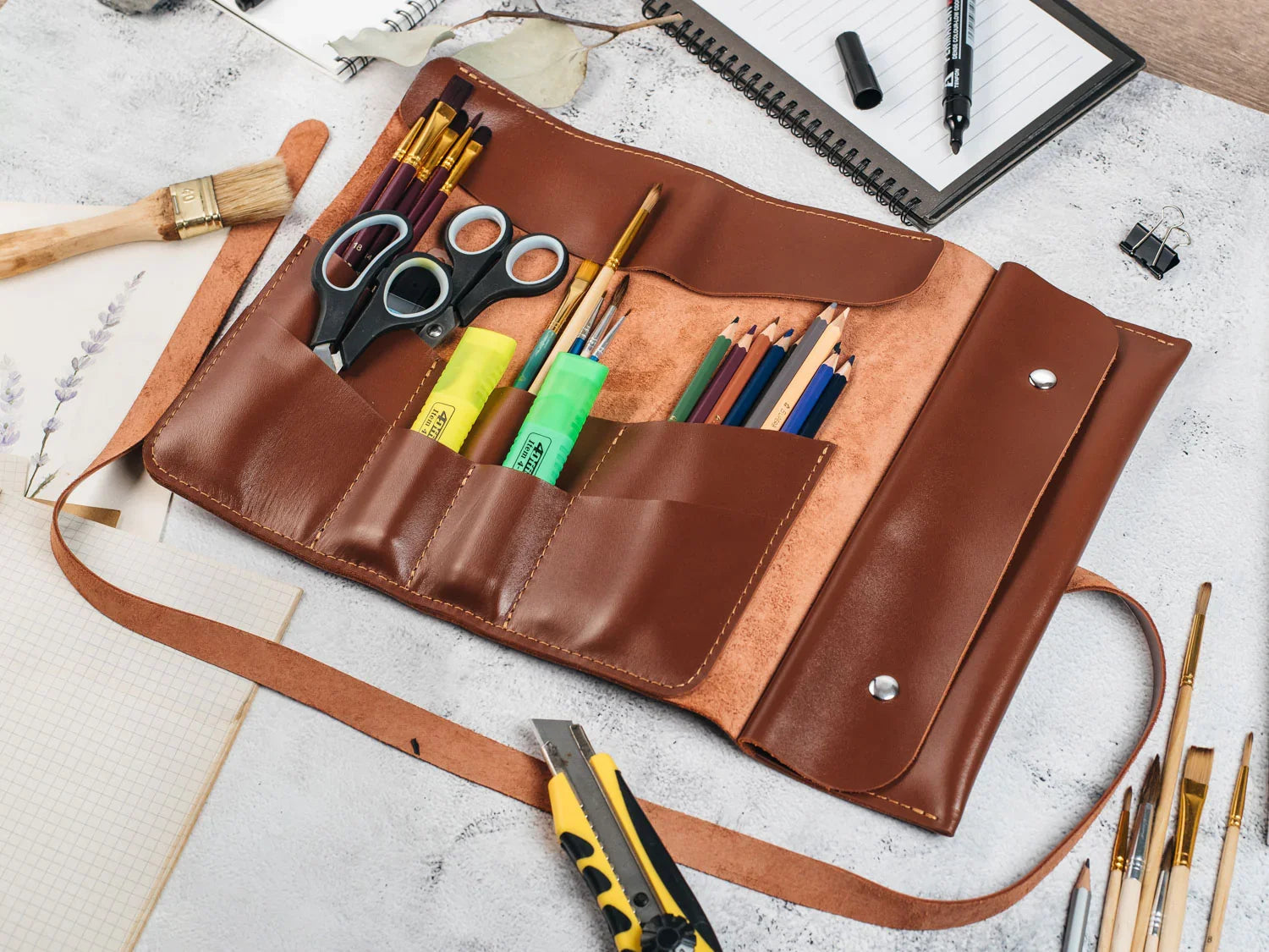 Універсальний шкіряний рол, створений для тих, хто цінує порядок, естетику та зручність. Підійде художникам, візажистам, архітекторам, студентам і всім, хто працює з інструментами щодня. Компактний дизайн дозволяє тримати все під рукою — впорядковано, захищено і зі смаком.