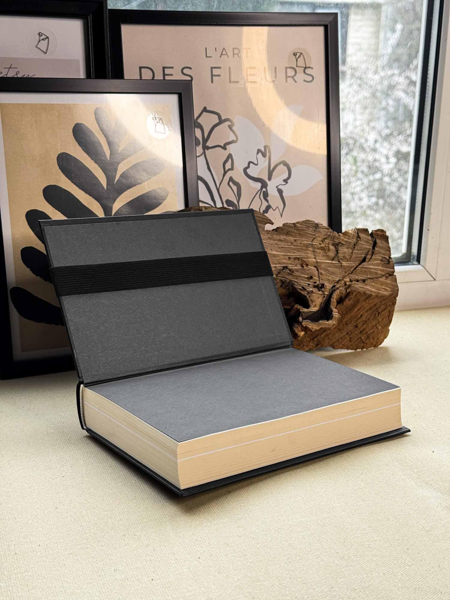 Еластична стрічка зовні / шкіра всередині – класичний режим закладки, що надійно утримує сторінки.