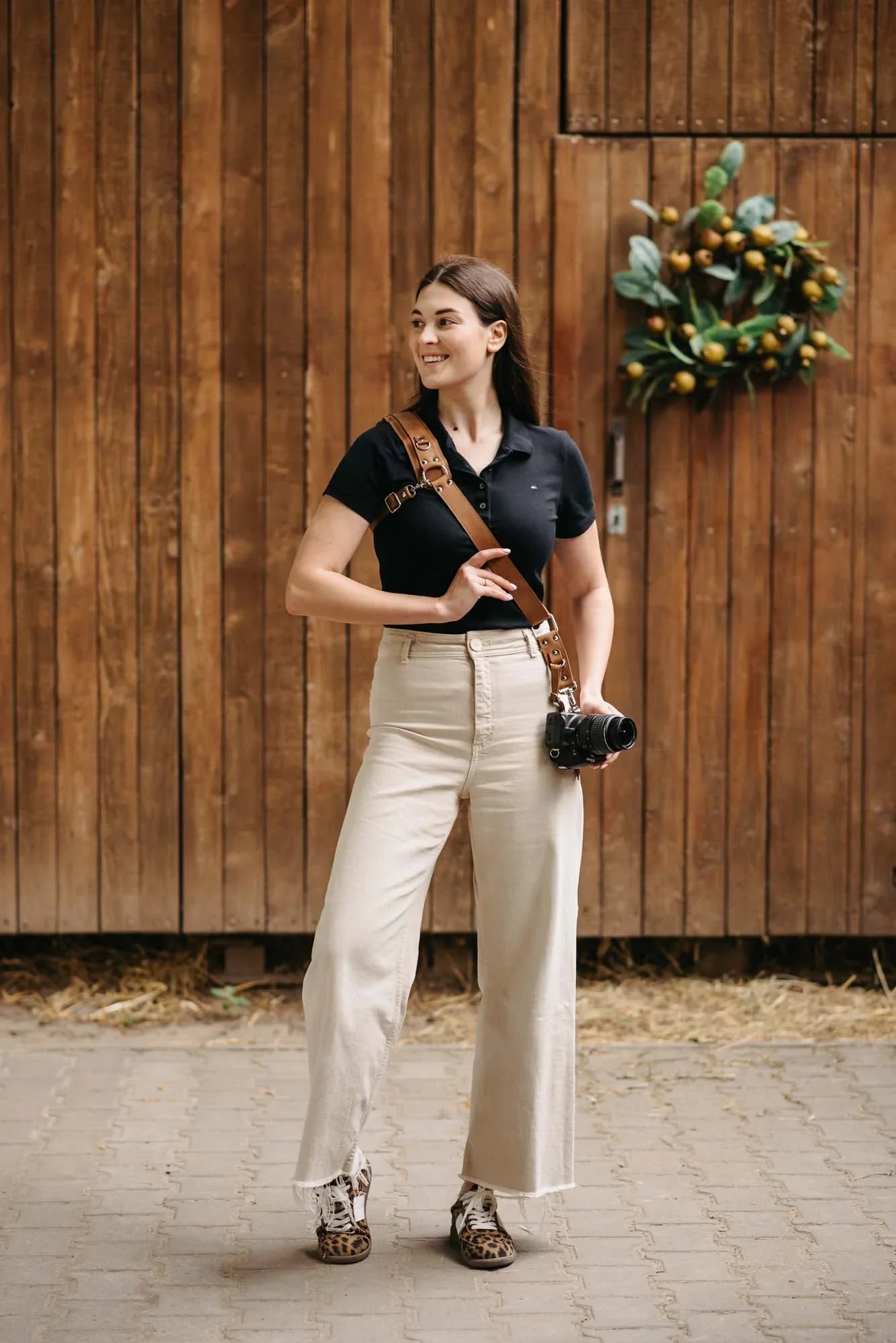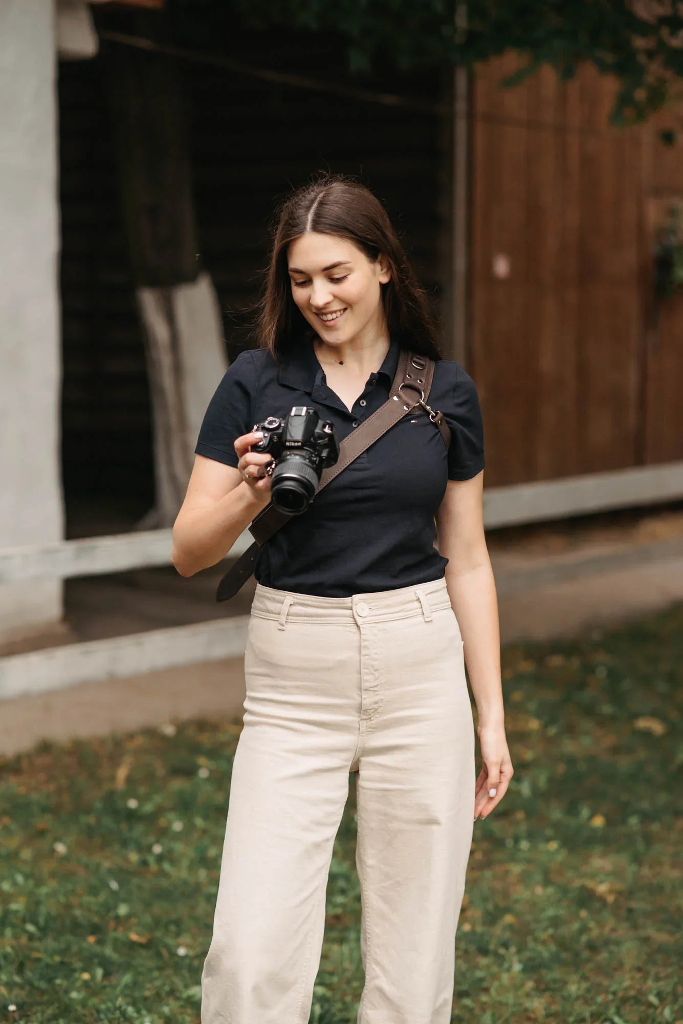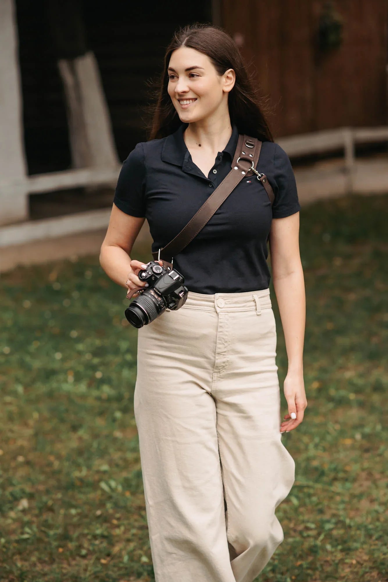 Одноремінна шкіряна портупея створена для фотографів, які цінують свободу руху й міцність матеріалів. Виготовлена з матової воскової шкіри, вона забезпечує надійну фіксацію камери без компромісів щодо комфорту.