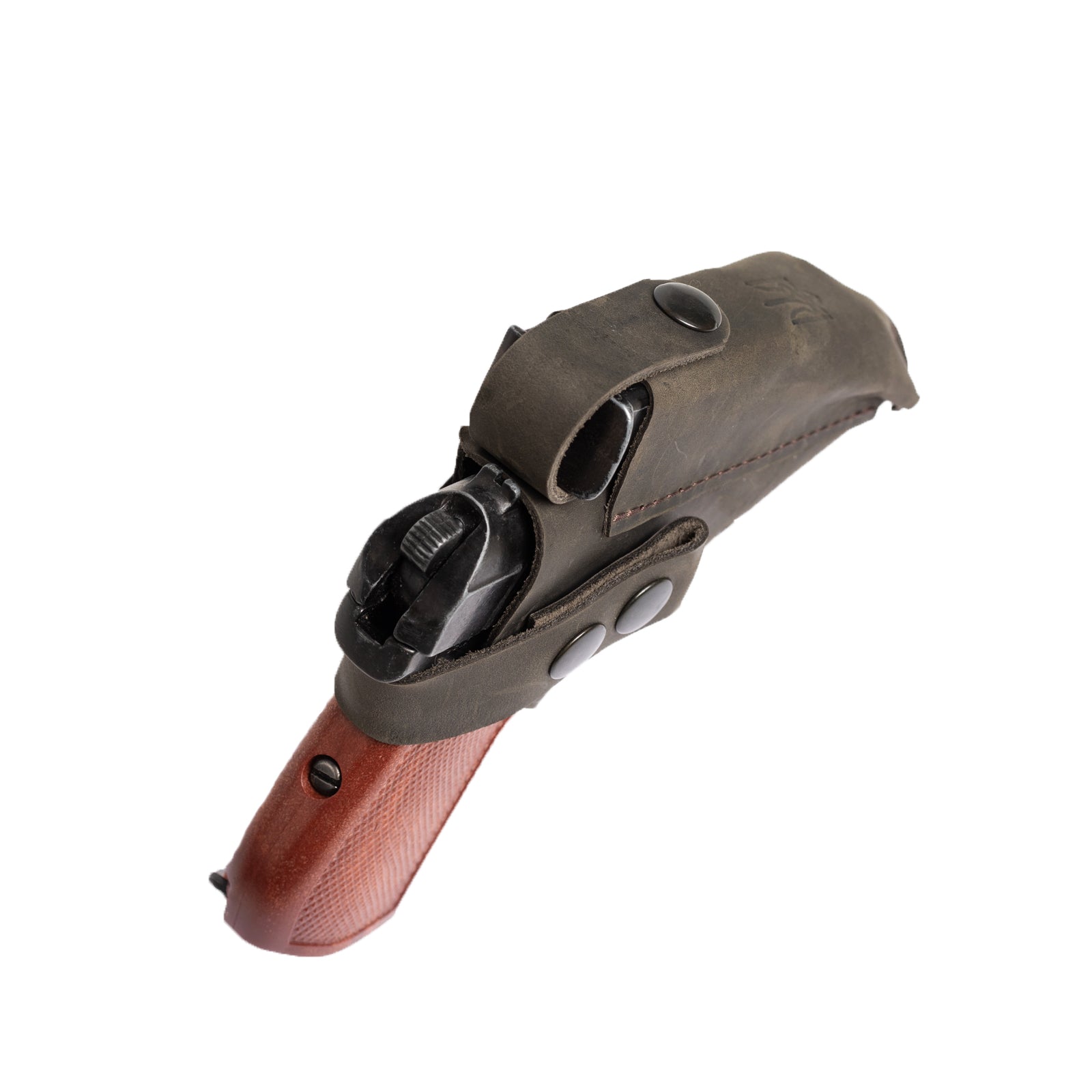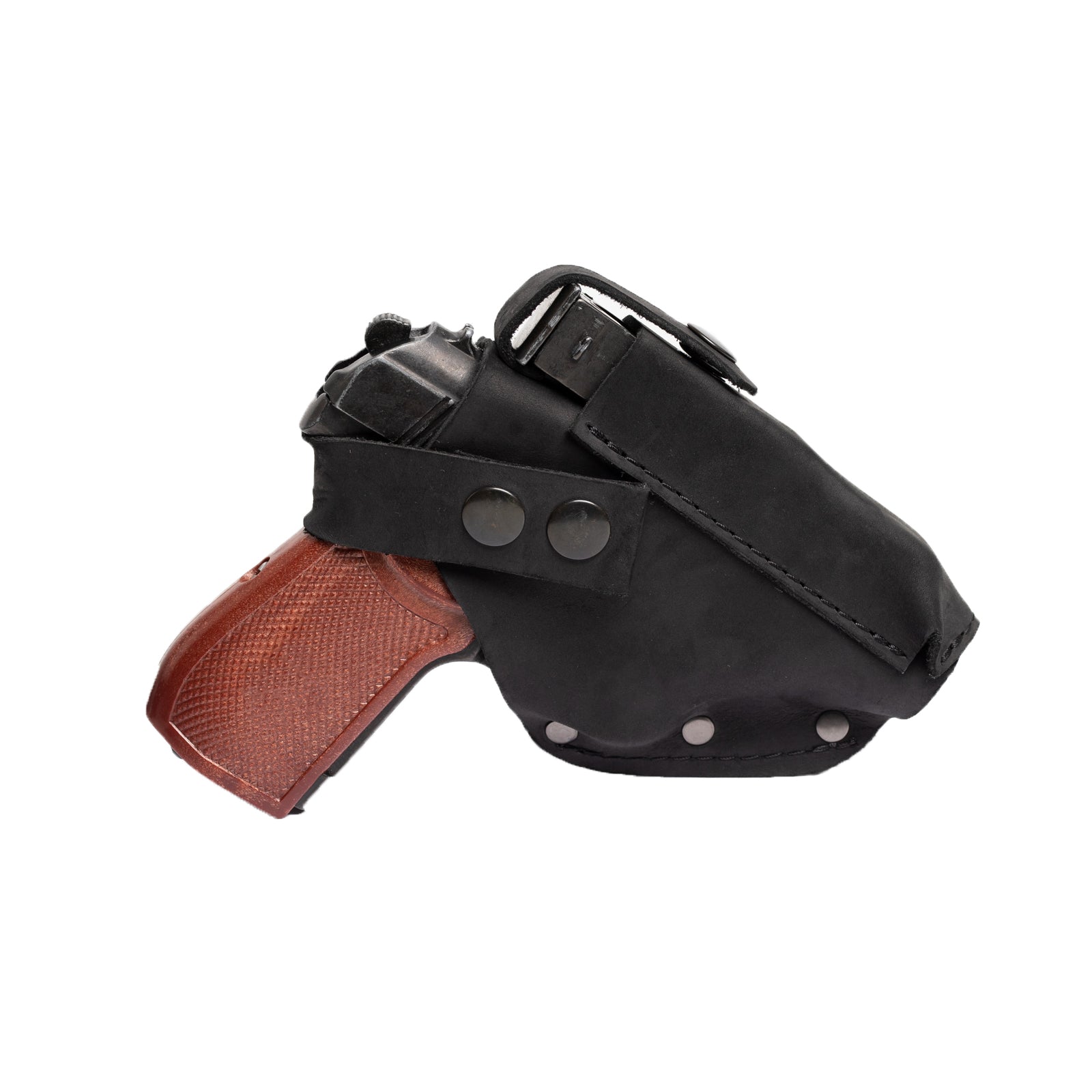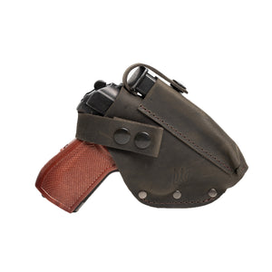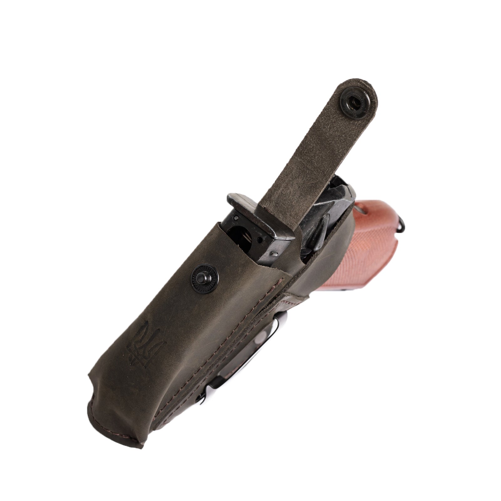 Класична і проста шкіряна кобура кріпиться на пояс за допомогою провушини, яка розрахована на ширину до 60 мм, а також має сталеву скобу, щоб сховати її за брюки. Важливою особливістю данної моделі є те, що вона універсальна і підходить як для лівші, так і для правші. Переваги натурального матеріалу очевидні: міцність та стійкість. Дана кобура навіть через довгий проміжок часу матиме вигляд нового.