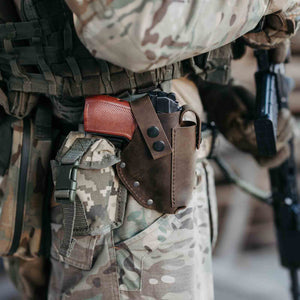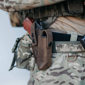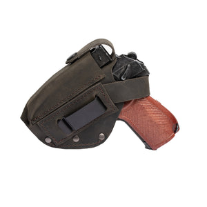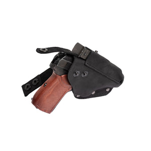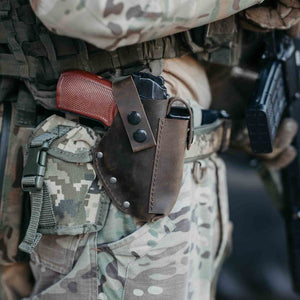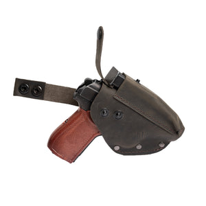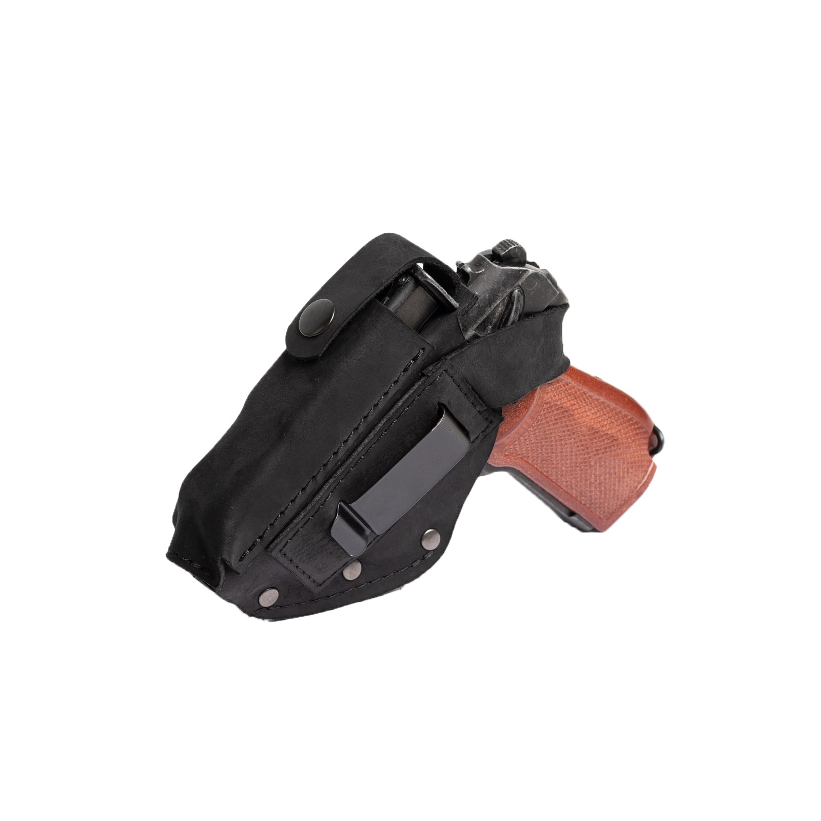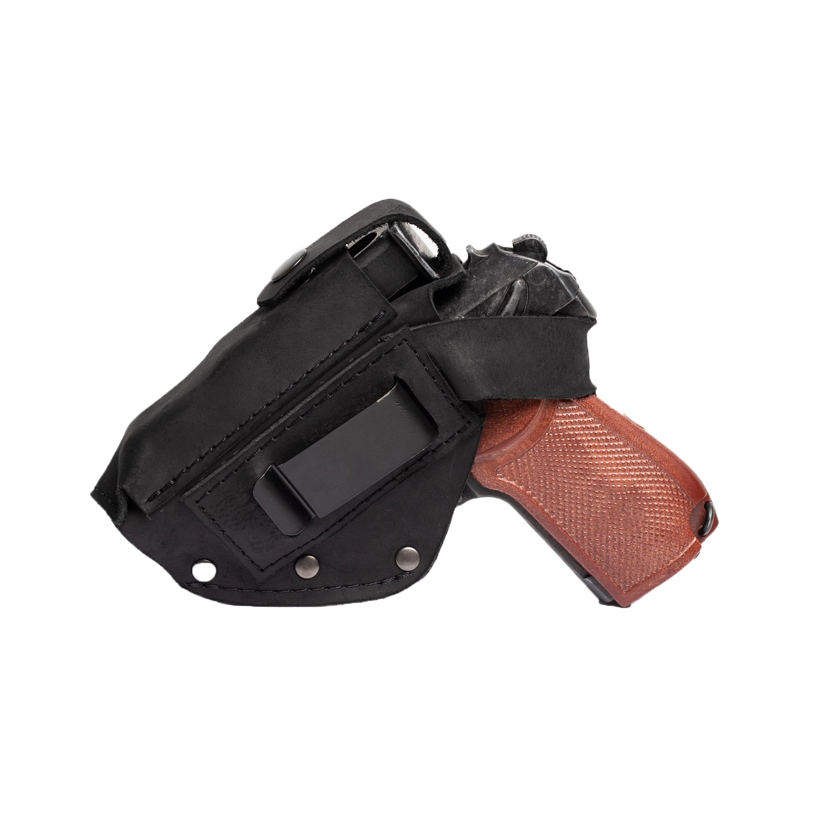 Класична і проста шкіряна кобура кріпиться на пояс за допомогою провушини, яка розрахована на ширину до 60 мм, а також має сталеву скобу, щоб сховати її за брюки. Важливою особливістю данної моделі є те, що вона універсальна і підходить як для лівші, так і для правші. Переваги натурального матеріалу очевидні: міцність та стійкість. Дана кобура навіть через довгий проміжок часу матиме вигляд нового.