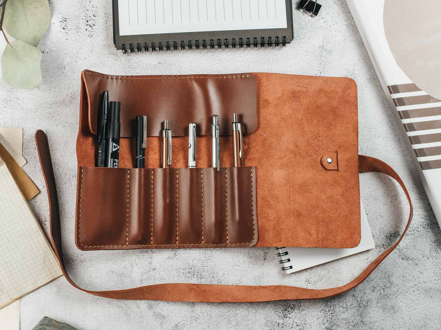 Цей шкіряний згорток може бути використаний не тільки для зберігання ручок та олівців, але і для інших письмових приладів, таких як маркери, фломастери і коректори. Його можна легко взяти з собою в поїздки, зустрічі та на роботу, щоб забезпечити зручний доступ до письмових приладів.