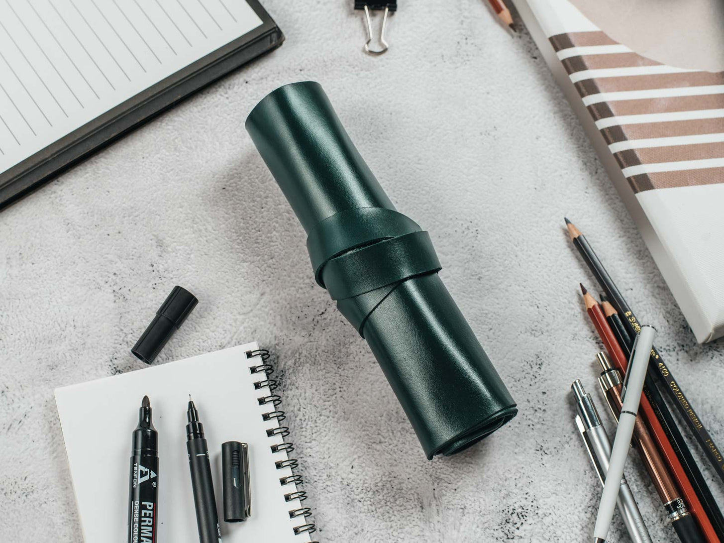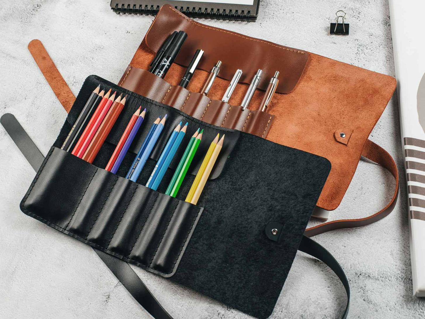 Кожна секція згортка розміщена на відстані одна від одної, що дозволяє легко знайти потрібну ручку або олівець. Згорток також може бути зручно згорнутий, а знімний ремінь з застібкою допоможе зберегти ваші ручки та олівці в безпеці.