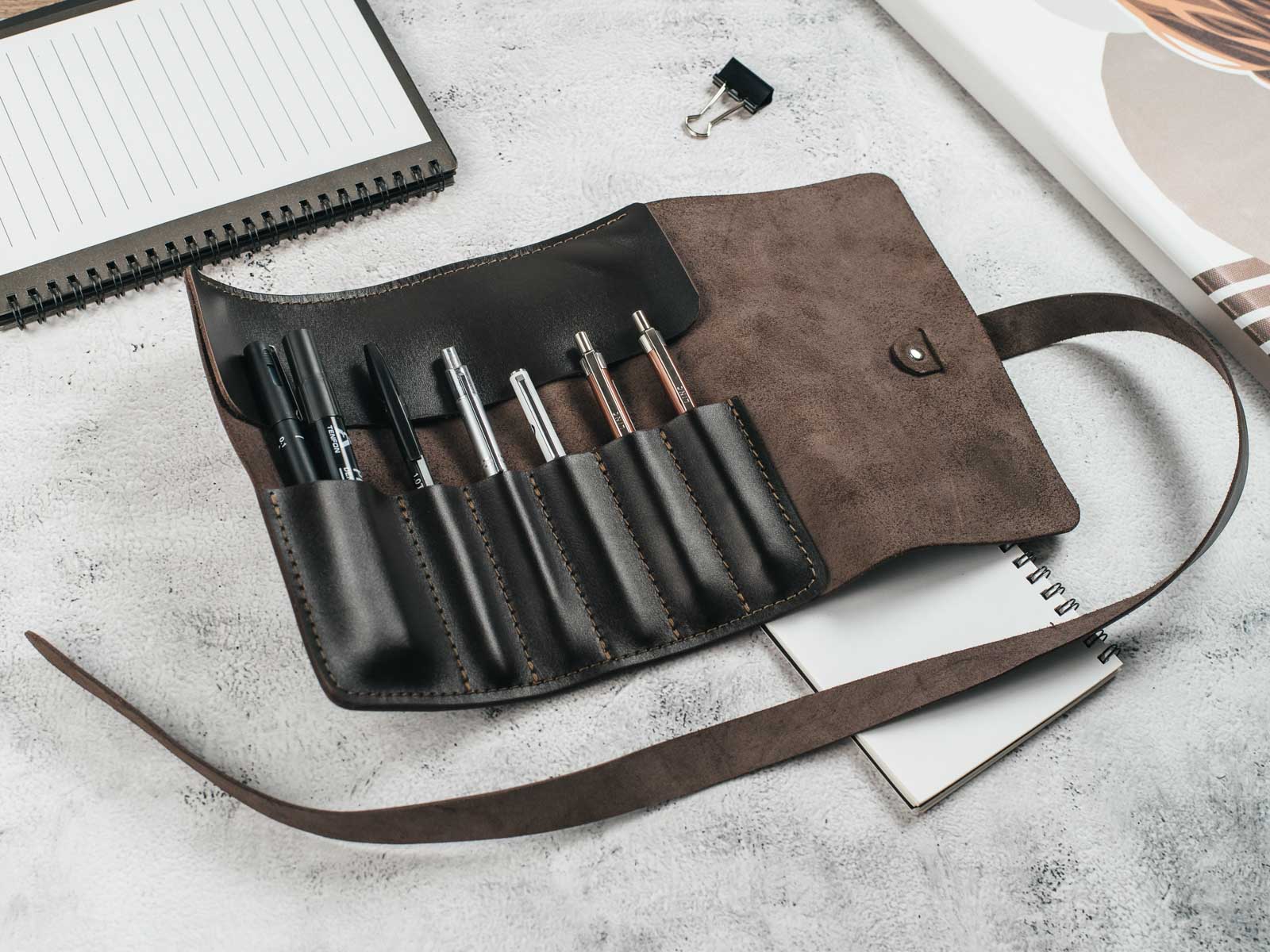 Загалом, шкіряний згорток для ручок та олівців - це корисний, стильний та практичний аксесуар, який додасть елегантність та функціональність до вашої повсякденної рутини.