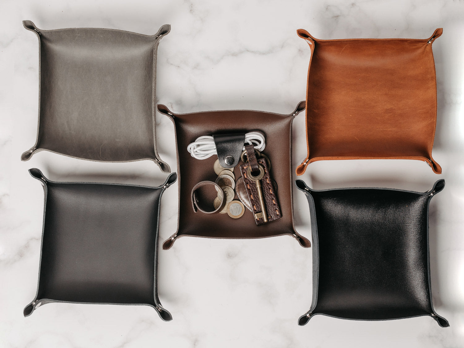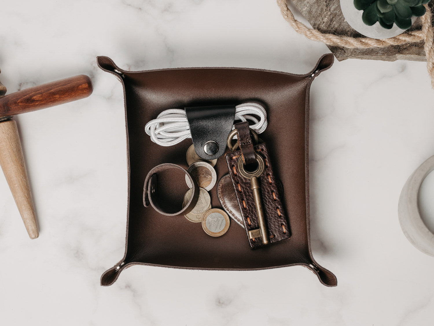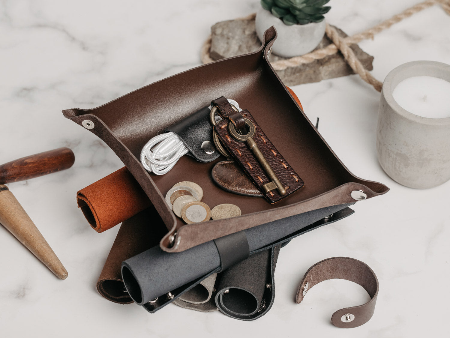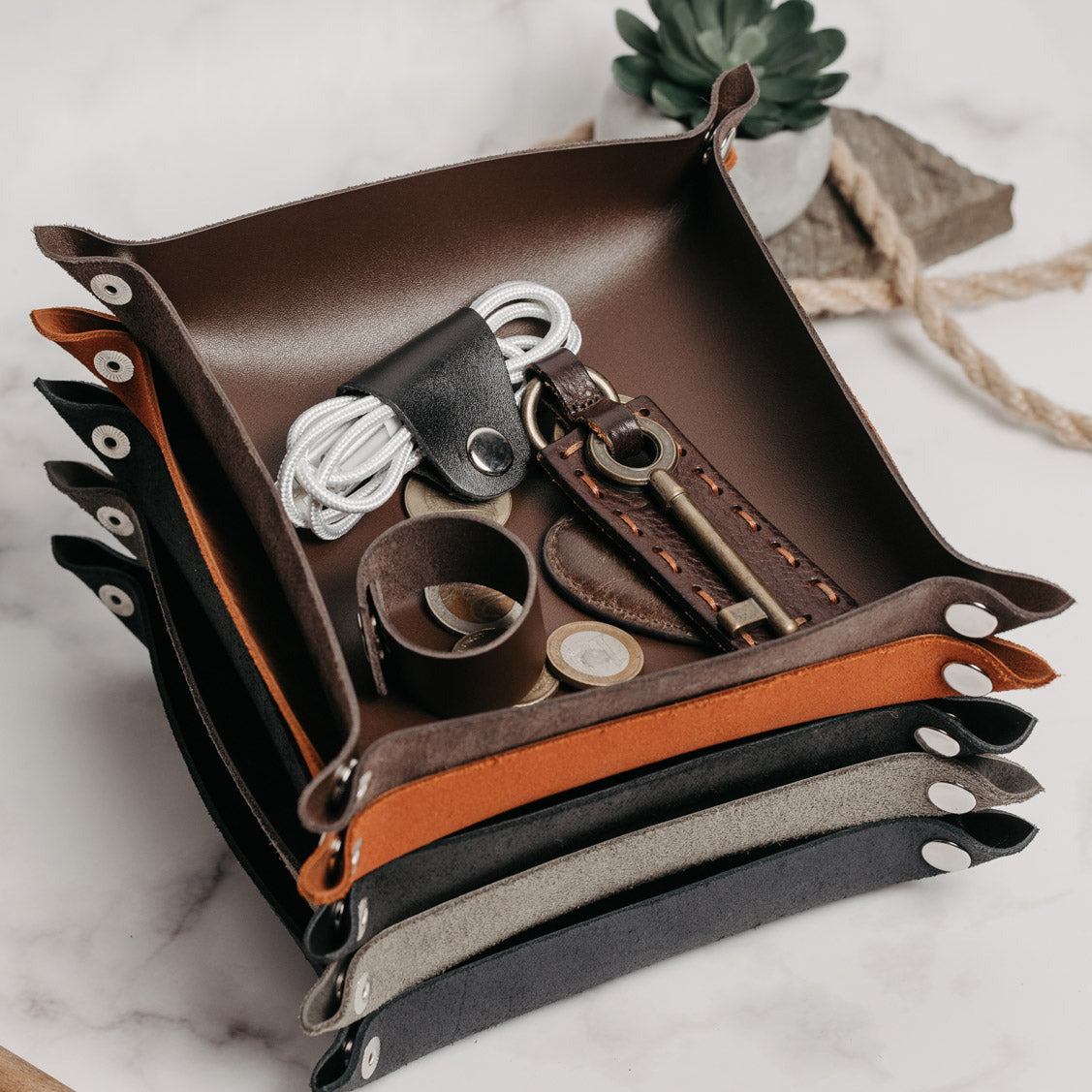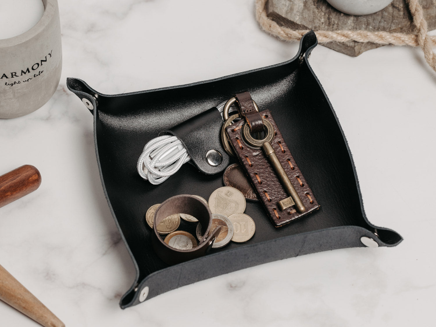 - Кожна підставка має неповторну фактуру шкіри з природними переходами відтінків. Вона може стати корисним і доречним подарунком для дому або пари – для зберігання обручок чи аксесуарів.