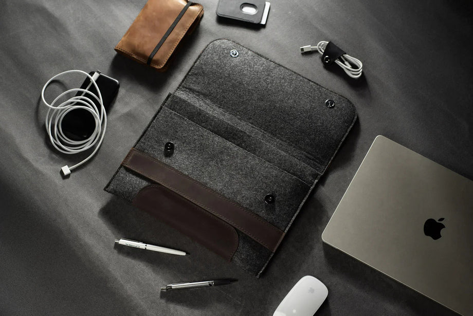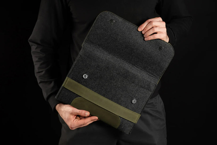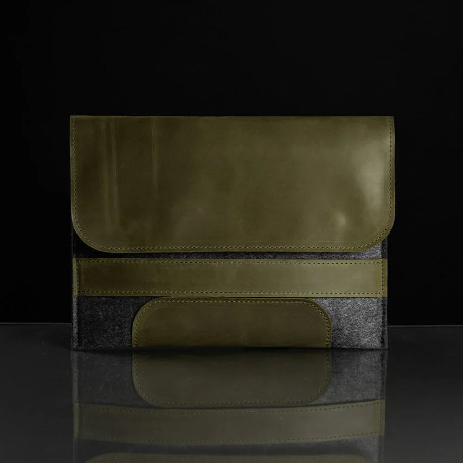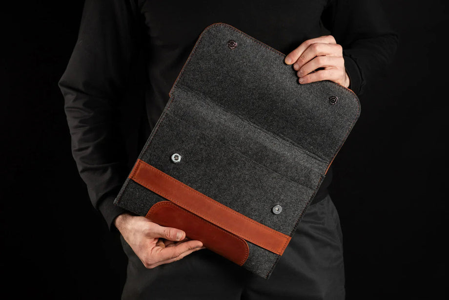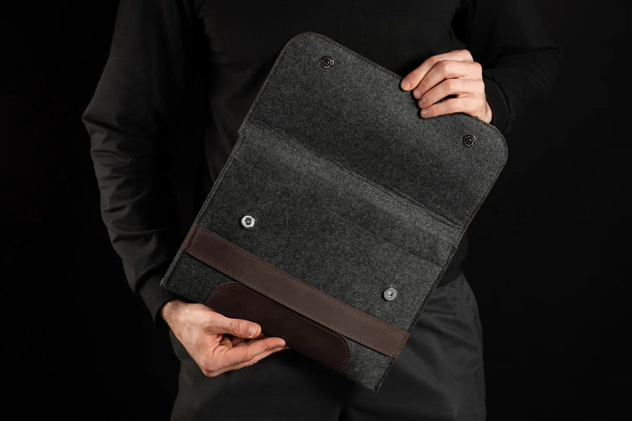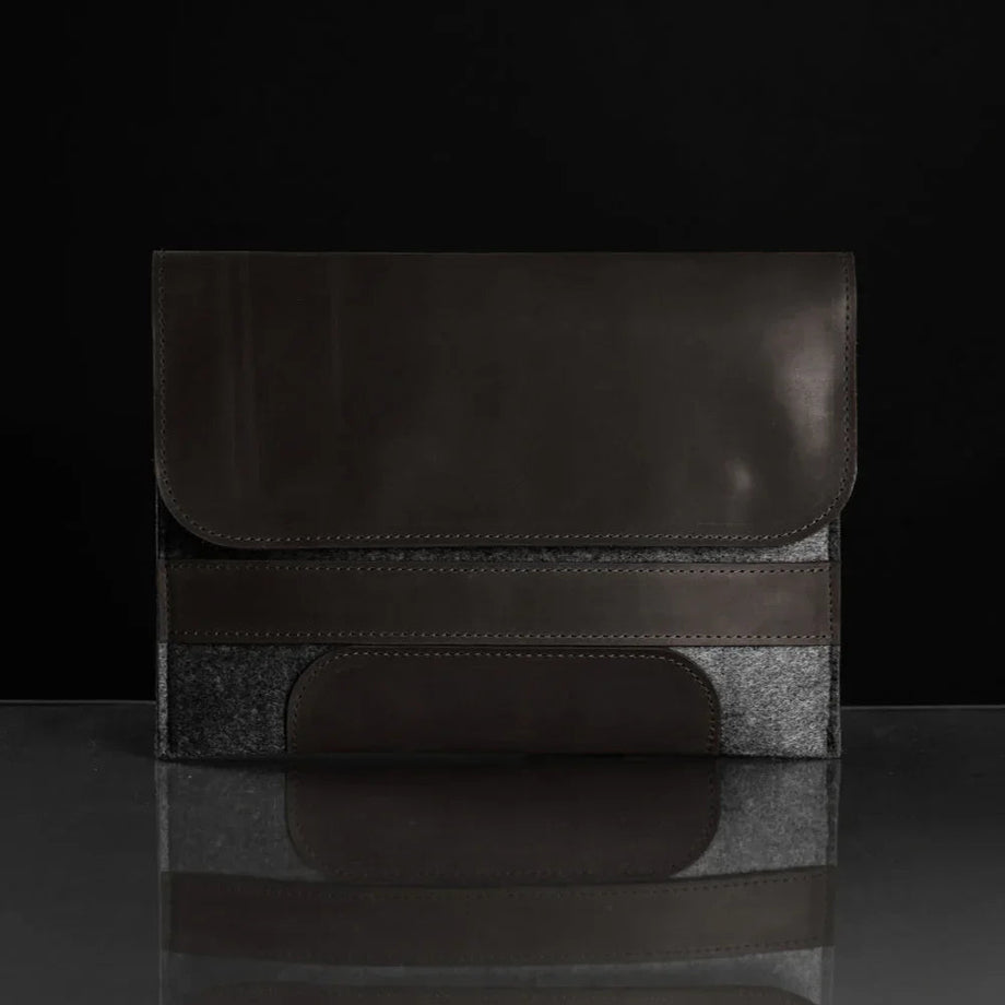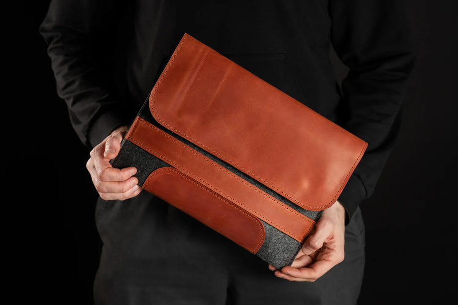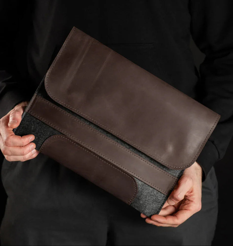Забезпечте своєму MacBook або iPad гідний захист із цим чохлом-клапаном, виготовленим вручну з щільного вовняного фетру та воскової шкіри Crazy Horse. Винтажна фактура та ефект “pull-up” надають кожному виробу унікального характеру, який розкривається з часом – роблячи його не лише практичним, а й особистим аксесуаром.