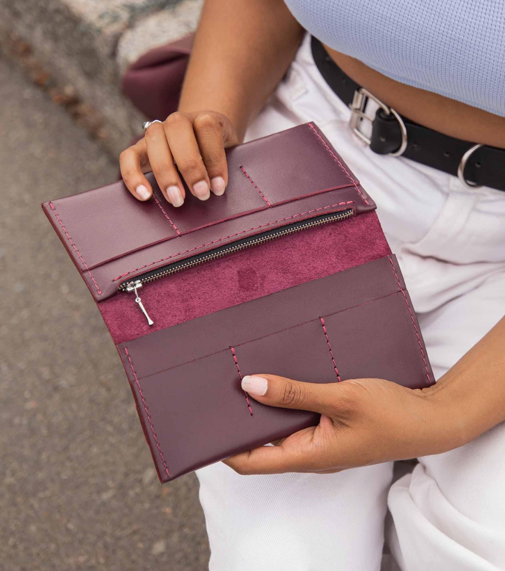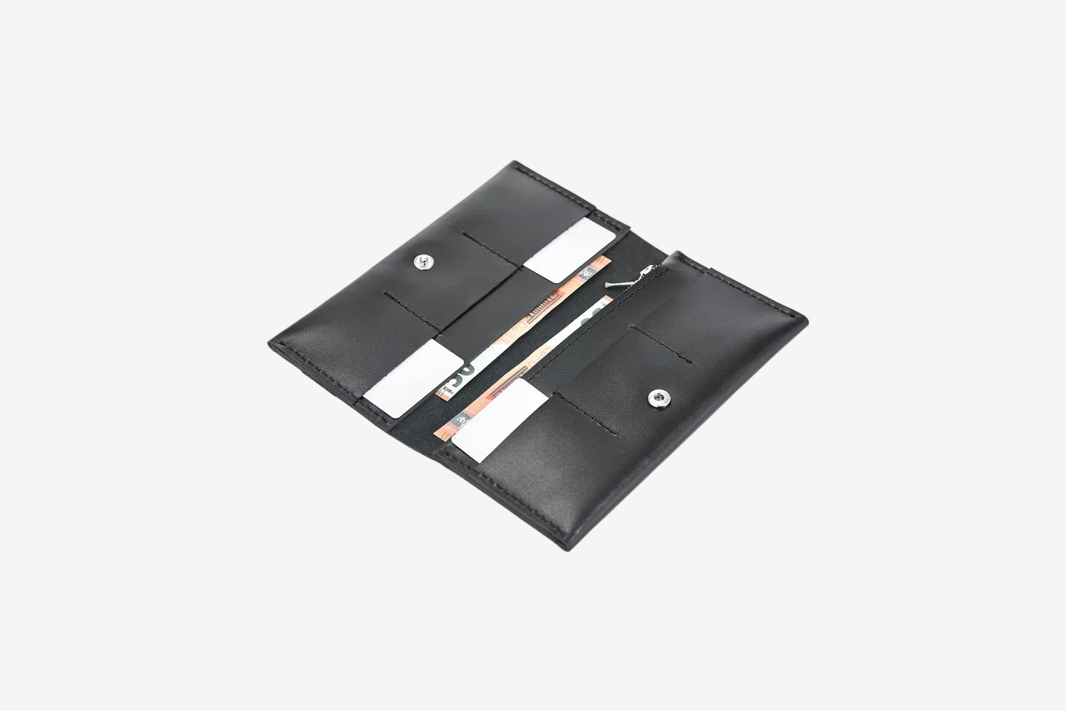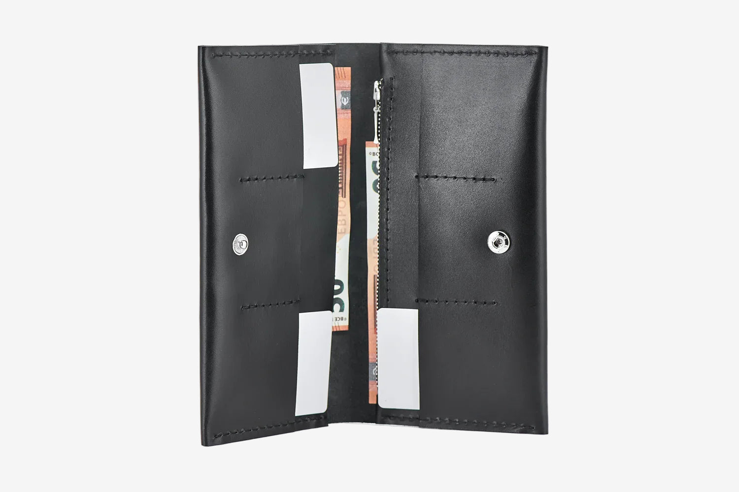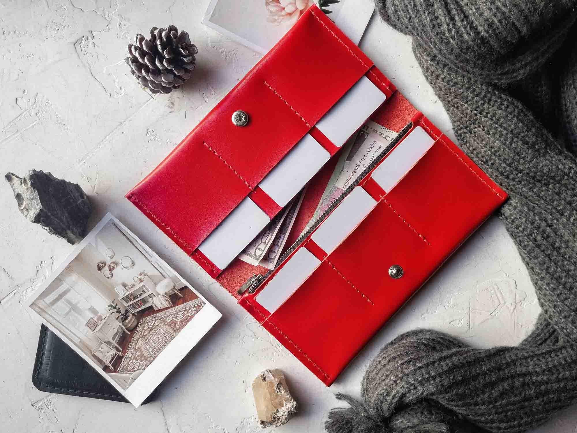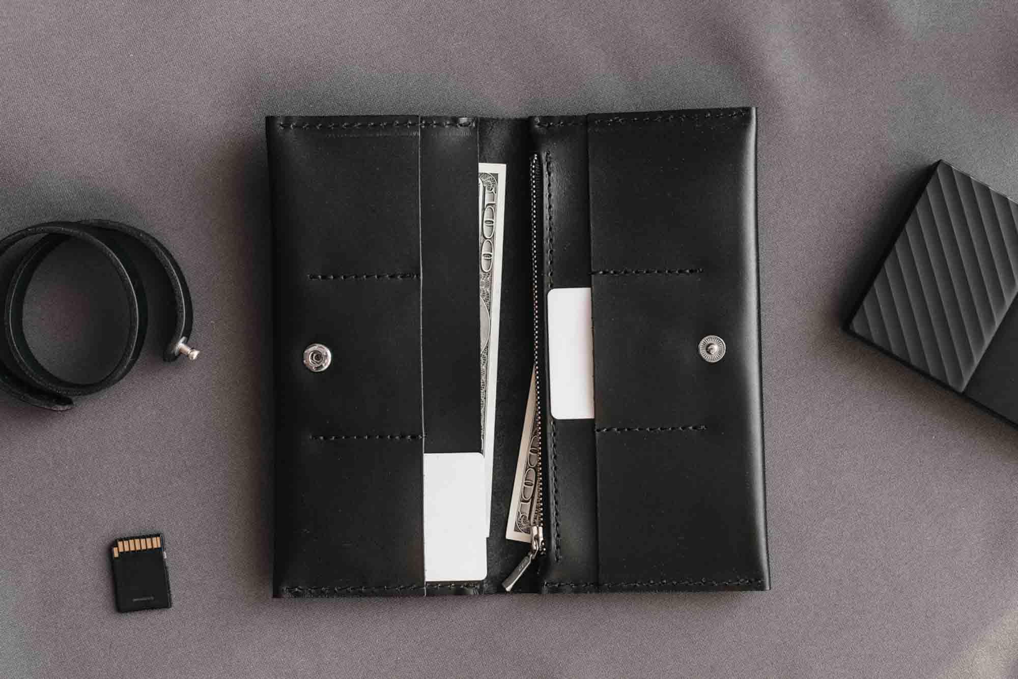 - Тонкий, але місткий – легко вміщує купюри, картки, монети й документи.