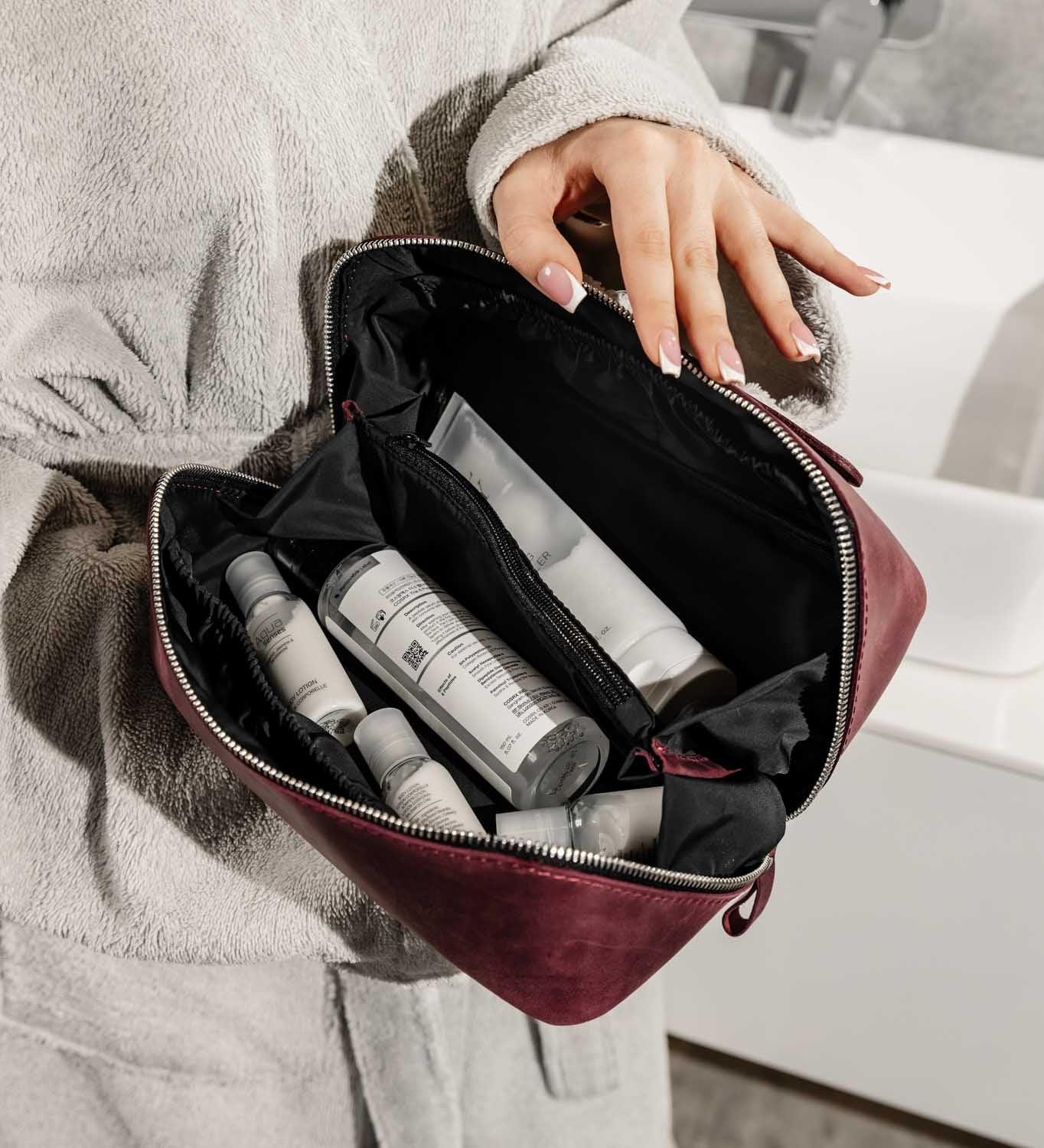 - Акуратна строчка та природна текстура шкіри роблять кожну косметичку унікальною.