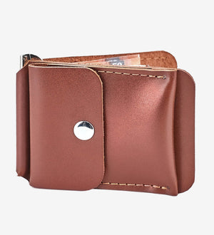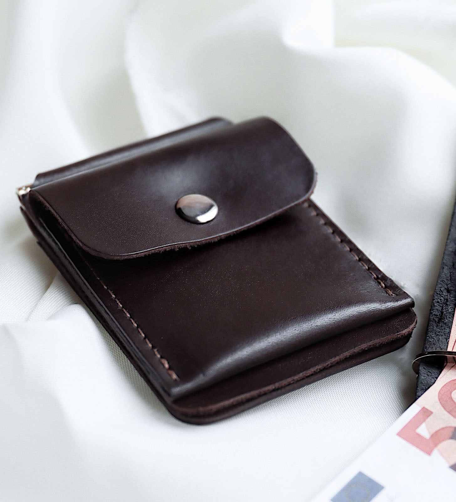 - Має 2 слоти під картки (місткість до 10 кредиток/дисконтів/візиток). На задній стінці розташована монетниця на металевій кнопці. Габарити розраховані під те, щоб носити в аксесуарі лише купюри.