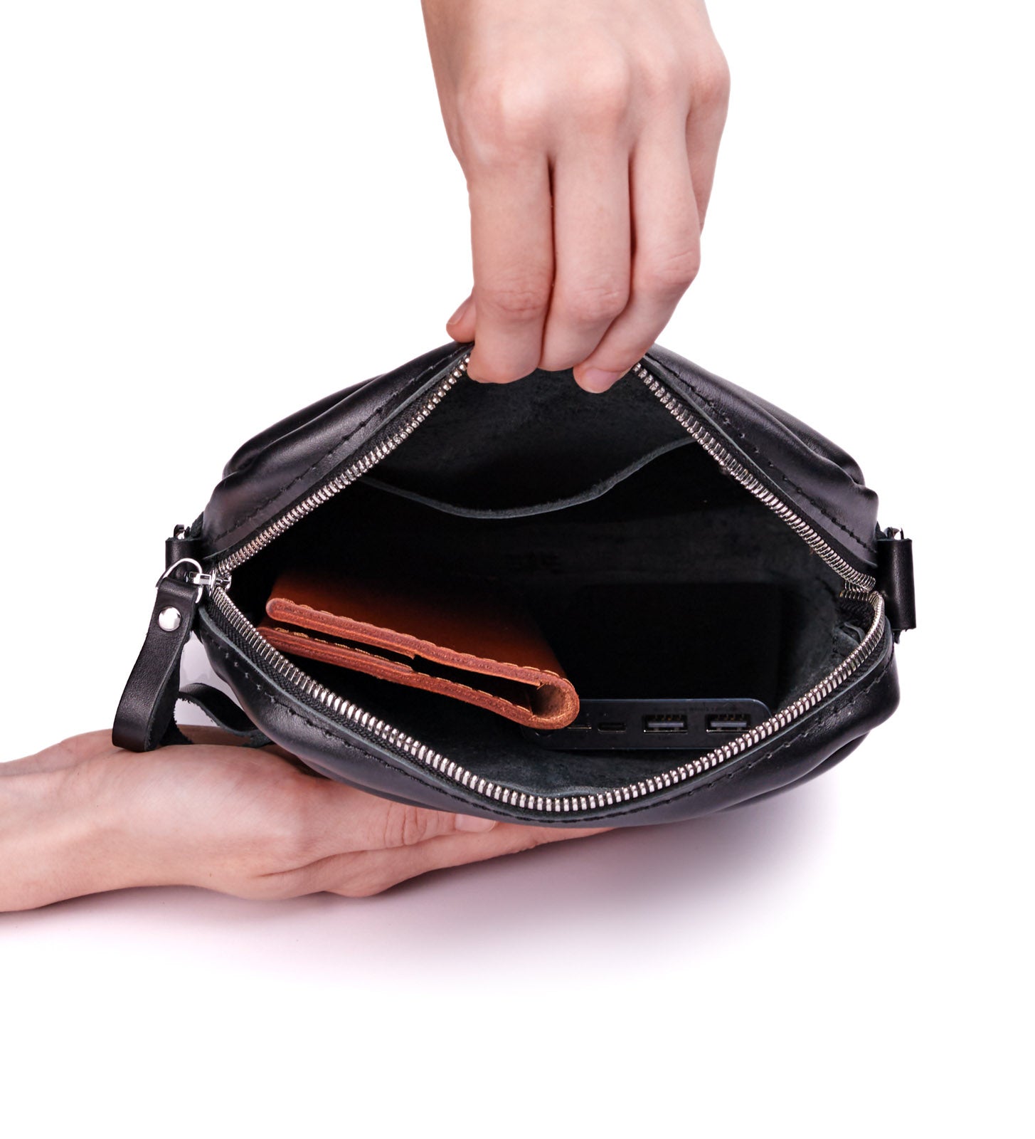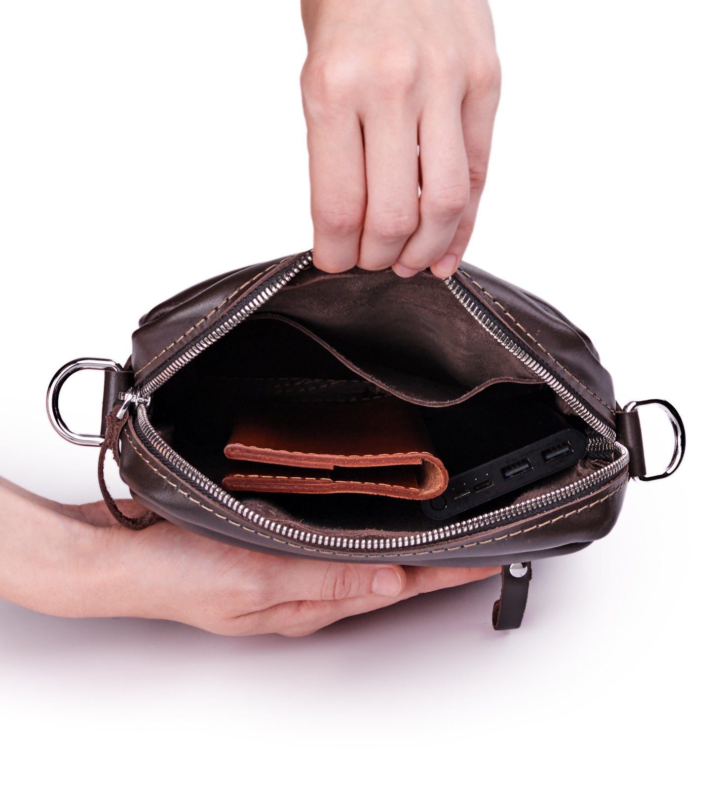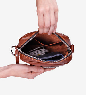 Розробили Weasy такою, щоб поєднувала класичний дизайн і практичність. Попри компактність своєї форми, шкіряна напрочуд містка: влізе блокнот формату А5, гаманець, документи, телефон, павер, ключі й навушники. Тож виручить в тих випадках, коли всі дрібнички треба кудись скласти, а брати рюкзак чи велику сумку якось недоречно. А коли кажемо про класичний дизайн, то маємо на увазі, що шкіряна впишеться як в більш офіційний, так і в повсякденний образ.