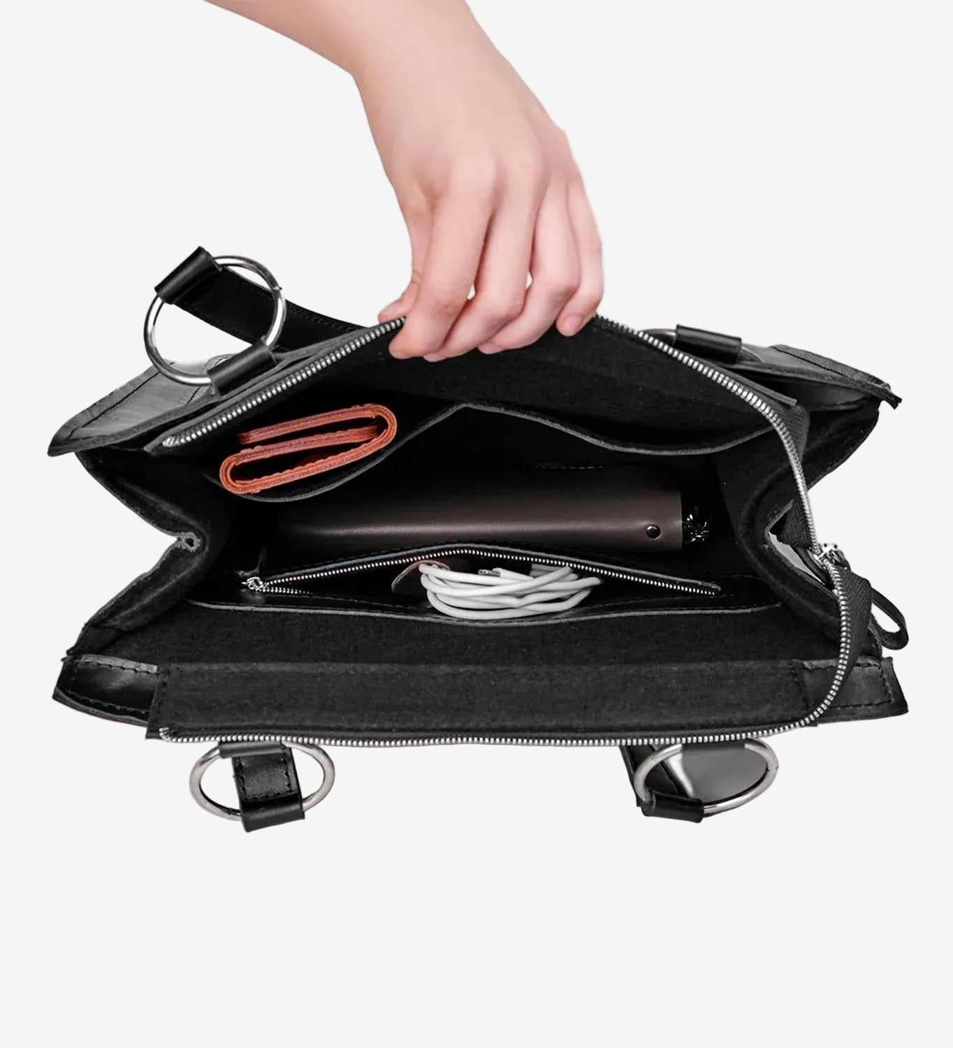 - Основне відділення: закривається блискавкою й вмістять документи формату А4, ноутбук до 13.3'' і навіть пляшку води (а якщо це вечір пʼятниці, то й вина).