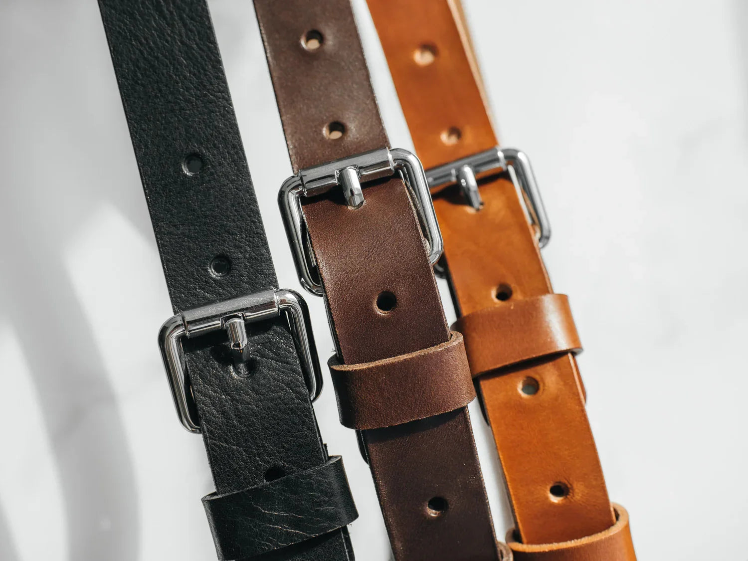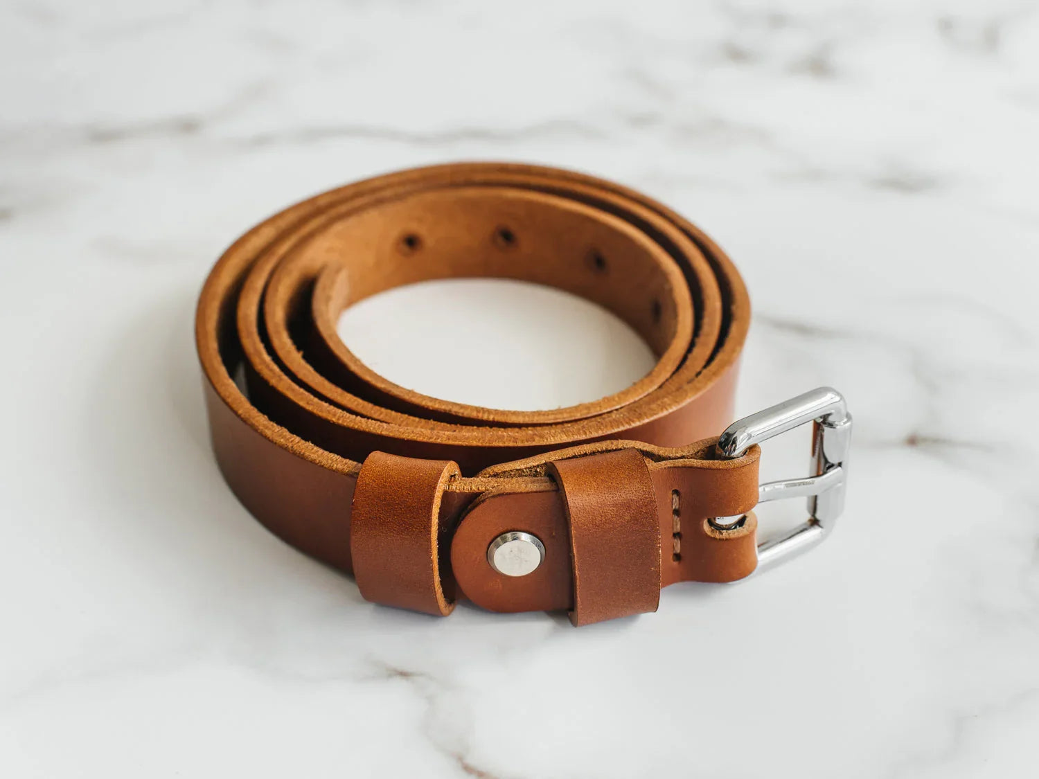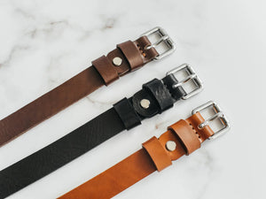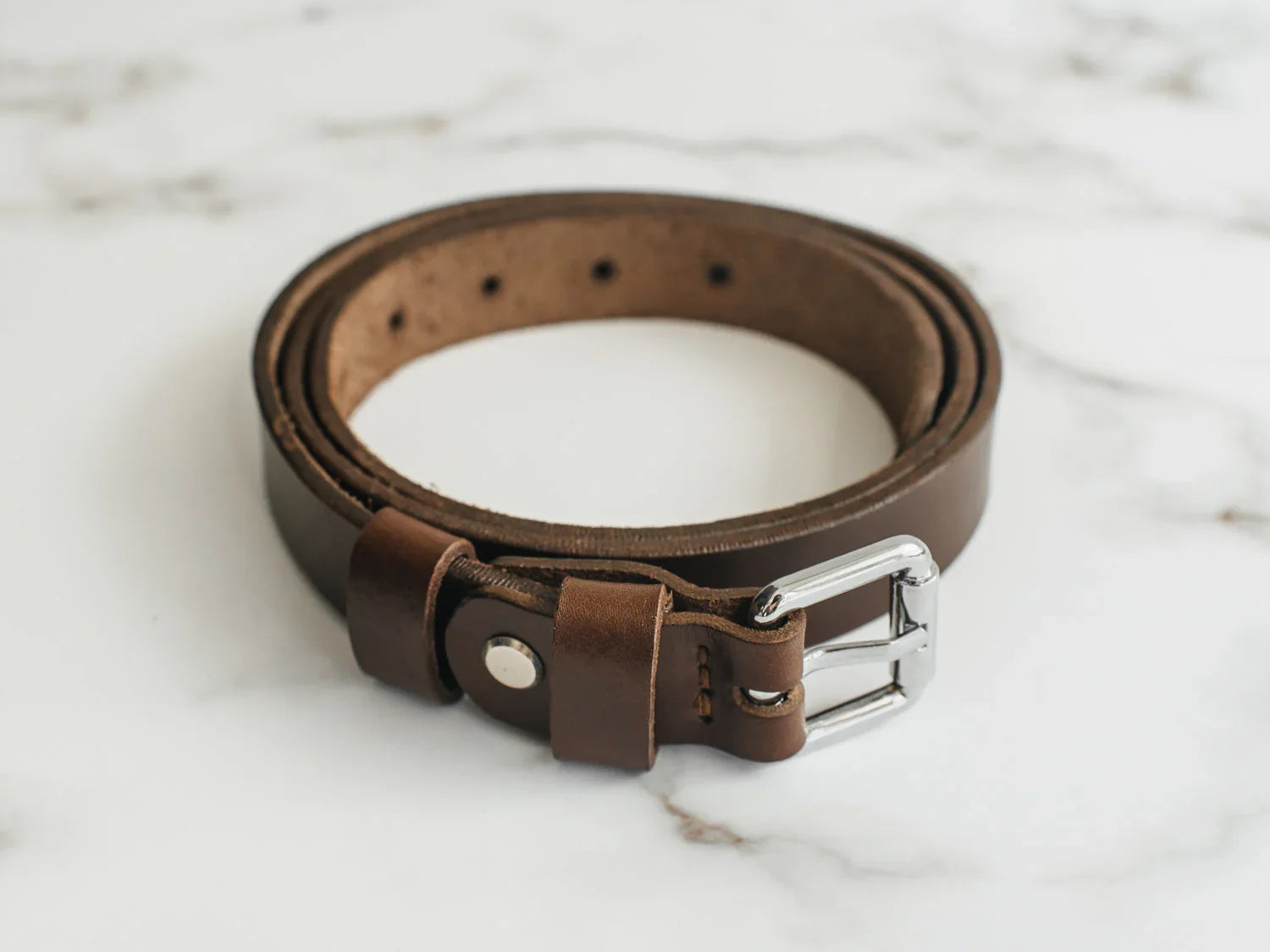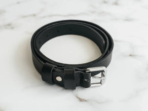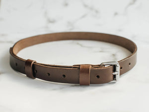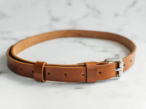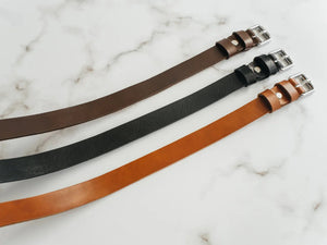 Ремінь виготовлений із цільного шматка шкіри рослинного дублення завтовшки 3.5–4 мм. Така шкіра зберігає природну щільність, витримує щоденне носіння та з роками набуває благородної патини. Краї поліруються вручну без прошивки – це підкреслює мінімалістичний силует і запобігає зношуванню.