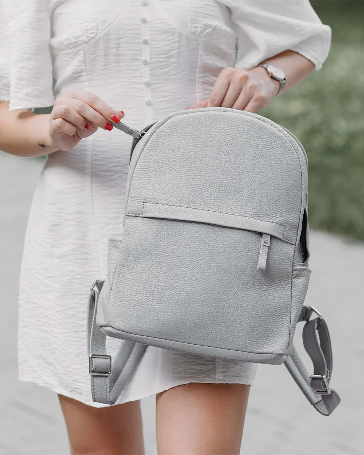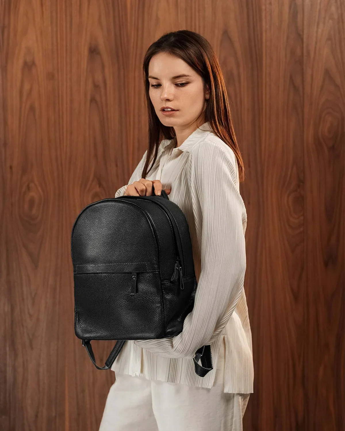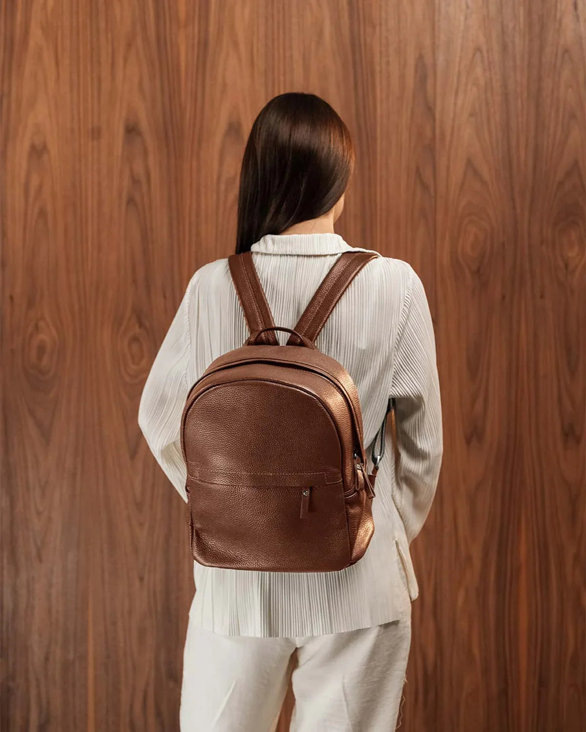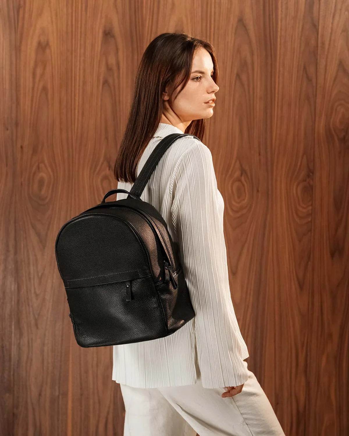 GraceBack – це свобода руху без втрати стилю. Каркасна форма тримає силует, завдяки чому рюкзак не зминається й не втрачає акуратного вигляду. Завдяки рівномірному розподілу ваги на обидва плечі GraceBack дарує відчуття свободи руху й легкості, яке неможливо отримати з сумкою на одному боці. Його зерниста шкіра з м’яким блиском додає текстури образу, не прив’язуючи до одного стилю – так само природно він виглядає поруч із піджаком і джинсами, поєднаними в кежуалі, як і з пальтом чи сукнею.