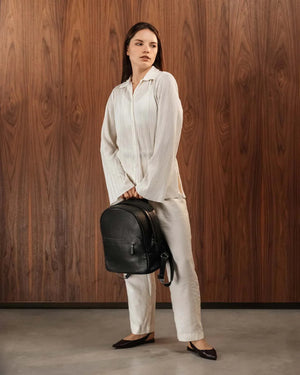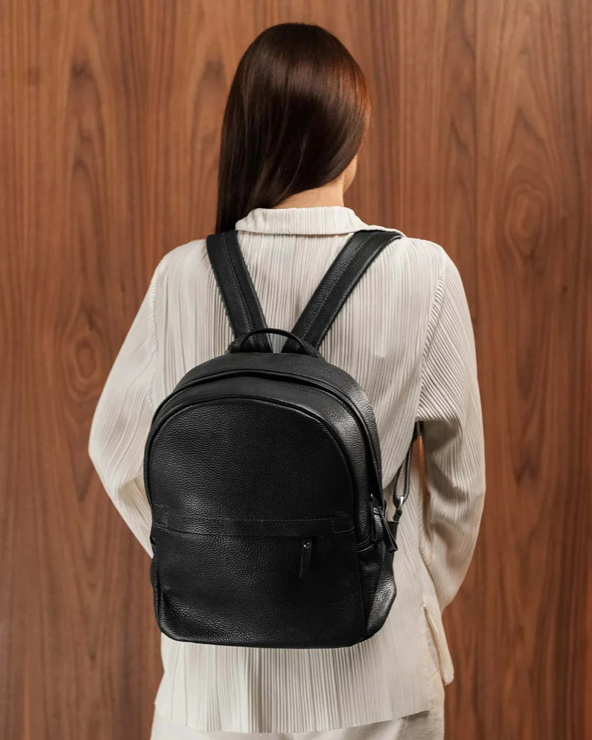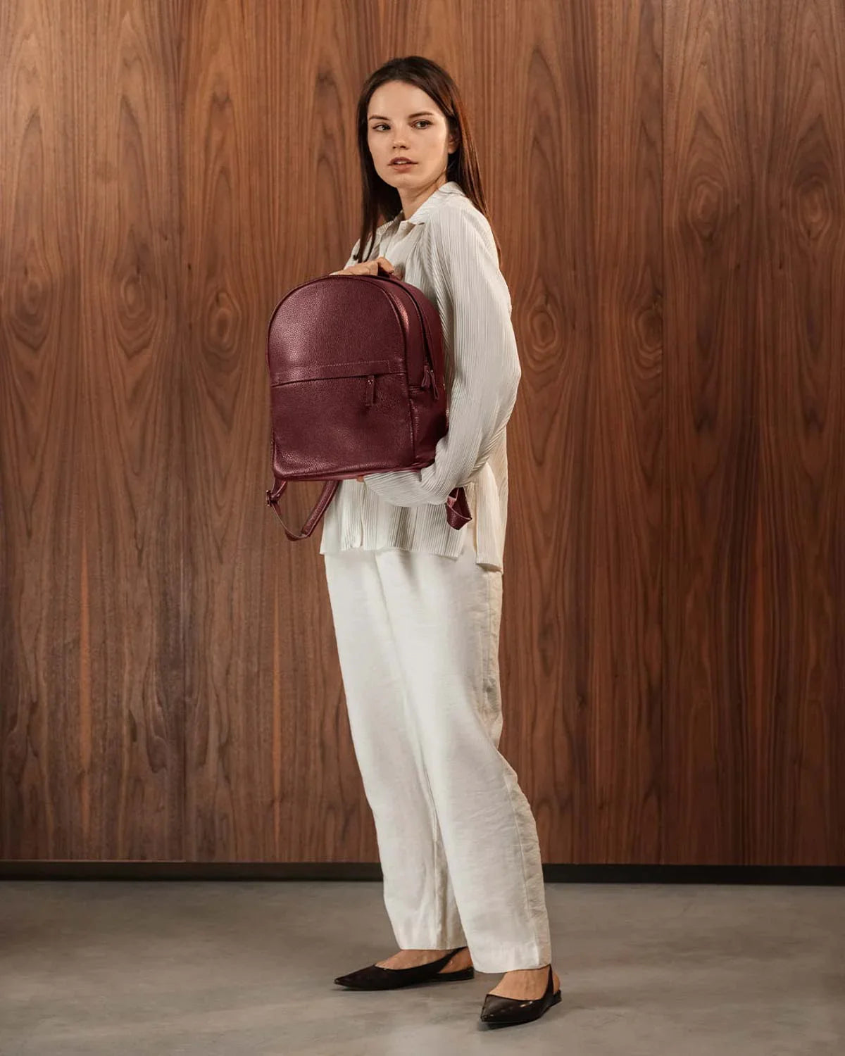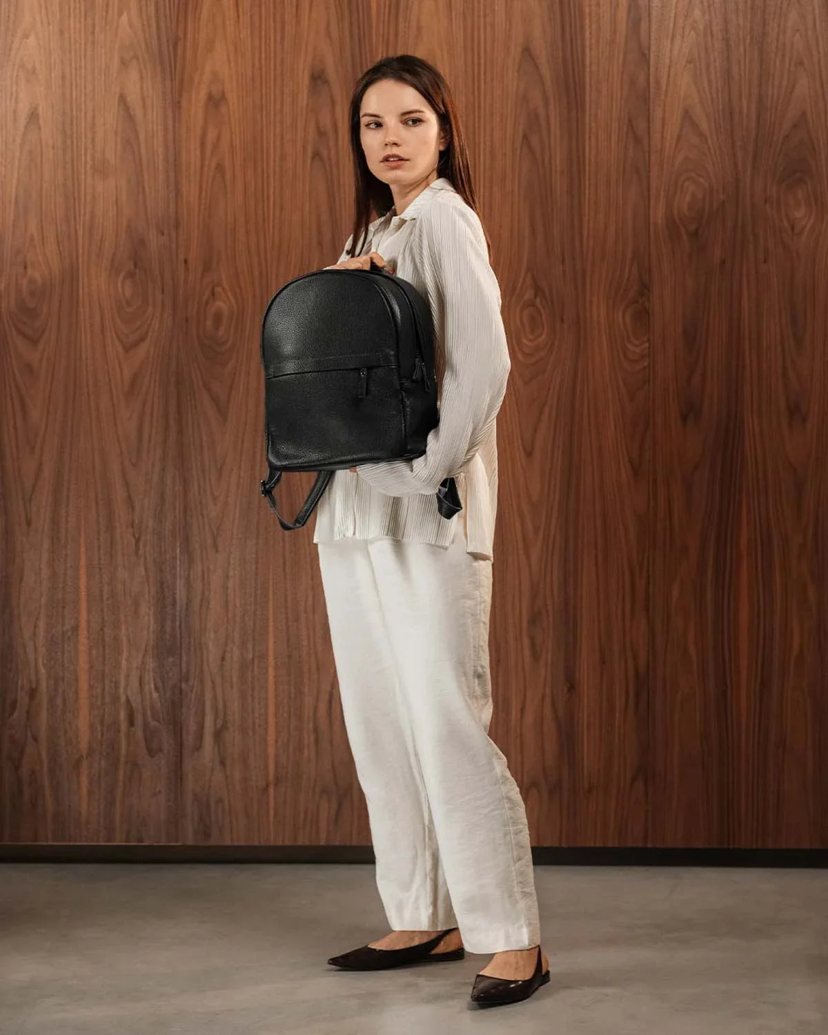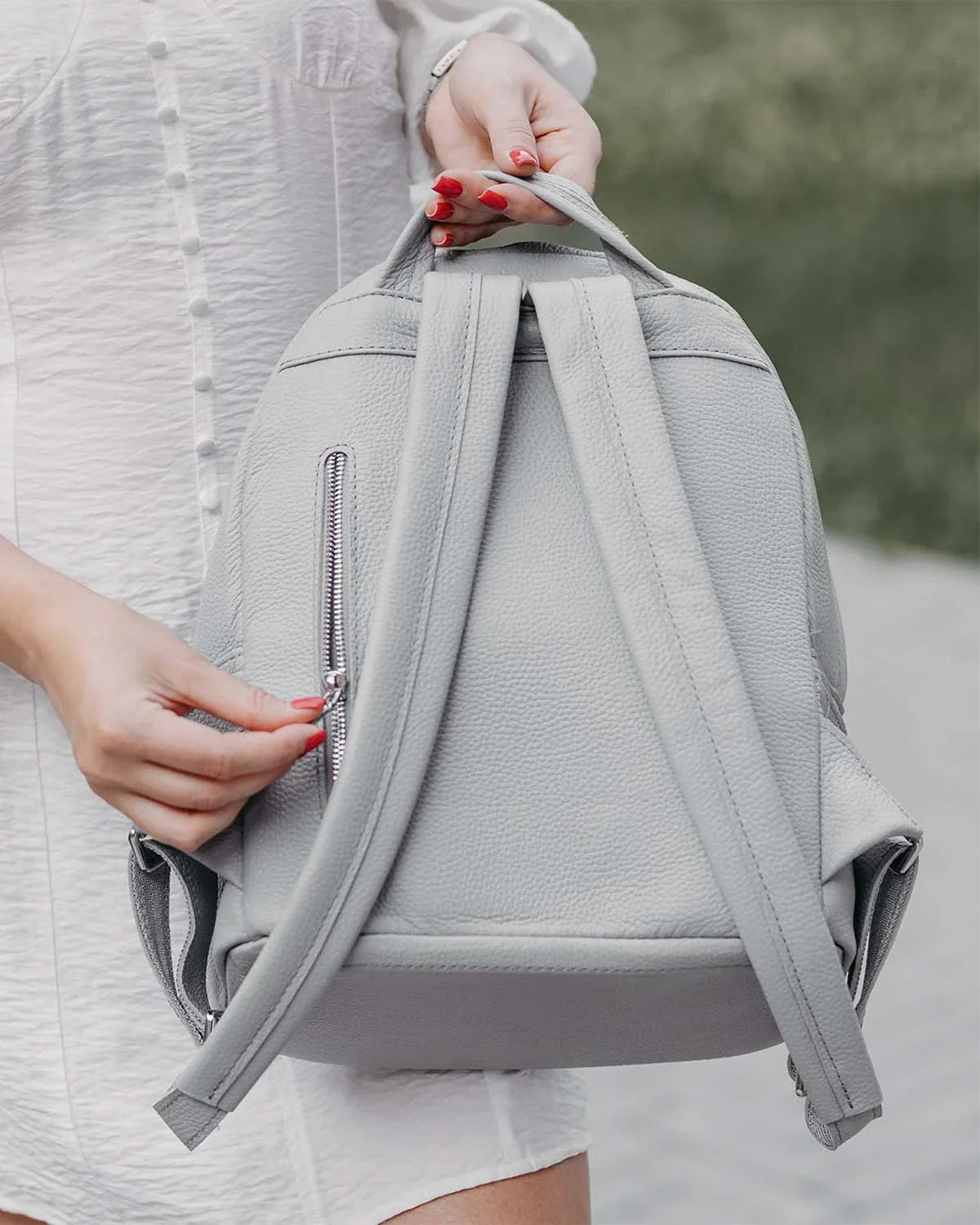 GraceBack – це свобода руху без втрати стилю. Каркасна форма тримає силует, завдяки чому рюкзак не зминається й не втрачає акуратного вигляду. Завдяки рівномірному розподілу ваги на обидва плечі GraceBack дарує відчуття свободи руху й легкості, яке неможливо отримати з сумкою на одному боці. Його зерниста шкіра з м’яким блиском додає текстури образу, не прив’язуючи до одного стилю – так само природно він виглядає поруч із піджаком і джинсами, поєднаними в кежуалі, як і з пальтом чи сукнею.